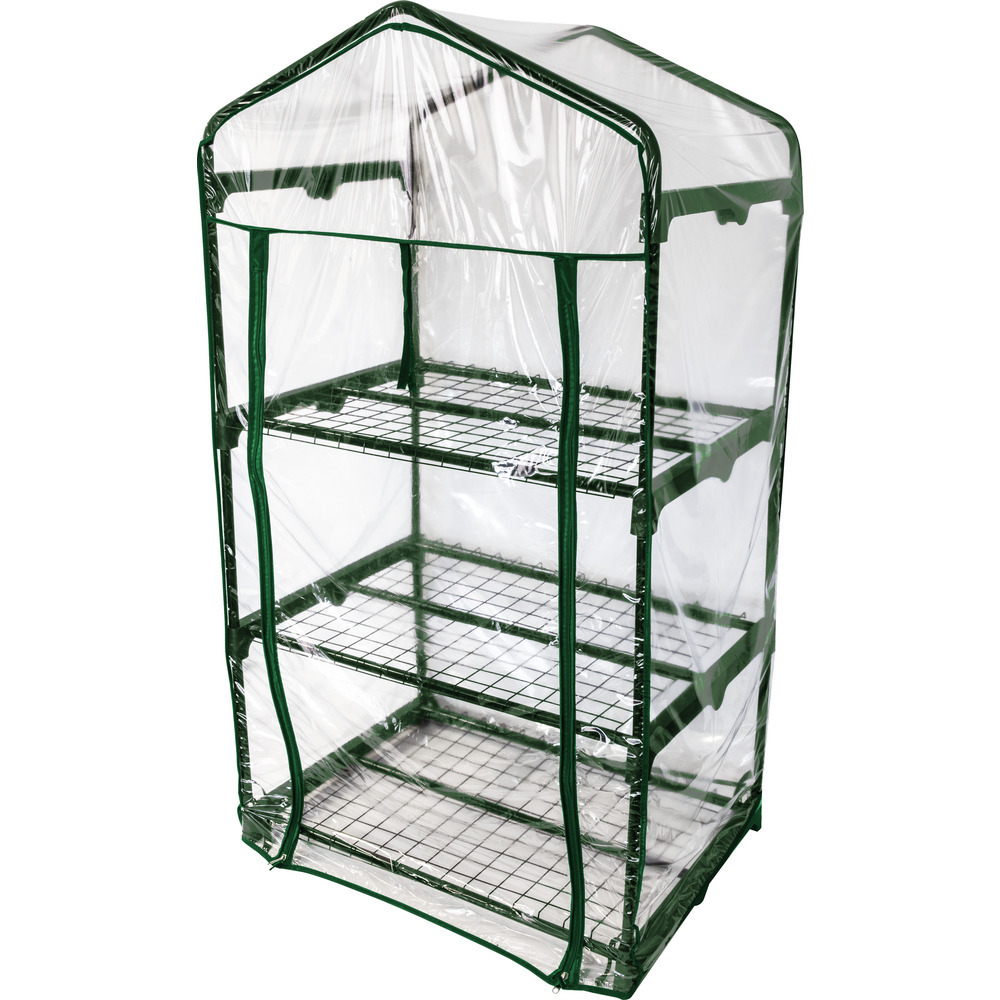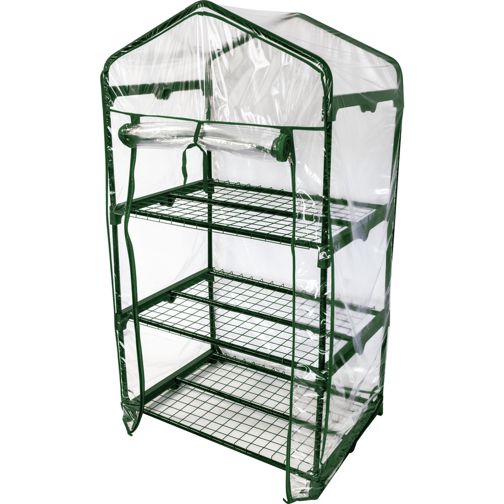 Kompaktes Foliengewächshaus zum geschützten Aufziehen Ihrer Pflanzen. Die darin erzeugten treibhausklimatischen Bedingungen sind die optimalen Voraussetzungen für ein gedeihliches Wachstum Ihrer Pflanzen. In diesem Gewächshäuschen sind Ihre Pflanzen Wind und anderen Wettereinflüssen nicht mehr schutzlos ausgeliefert. Der Stahlrohr-Rahmen und die drei Einlegeböden ergeben eine stabile Konstruktion.