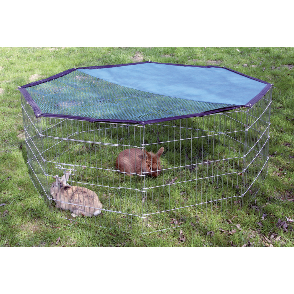 Hasengehege mit 8 Zaunelementen zu je 57 x 56 cm, verzinkte Ausführung. Ein Element mit Türe, inkl. Netz und integriertem Sonnenschutz.Einfache Montage mit Erdspießen.