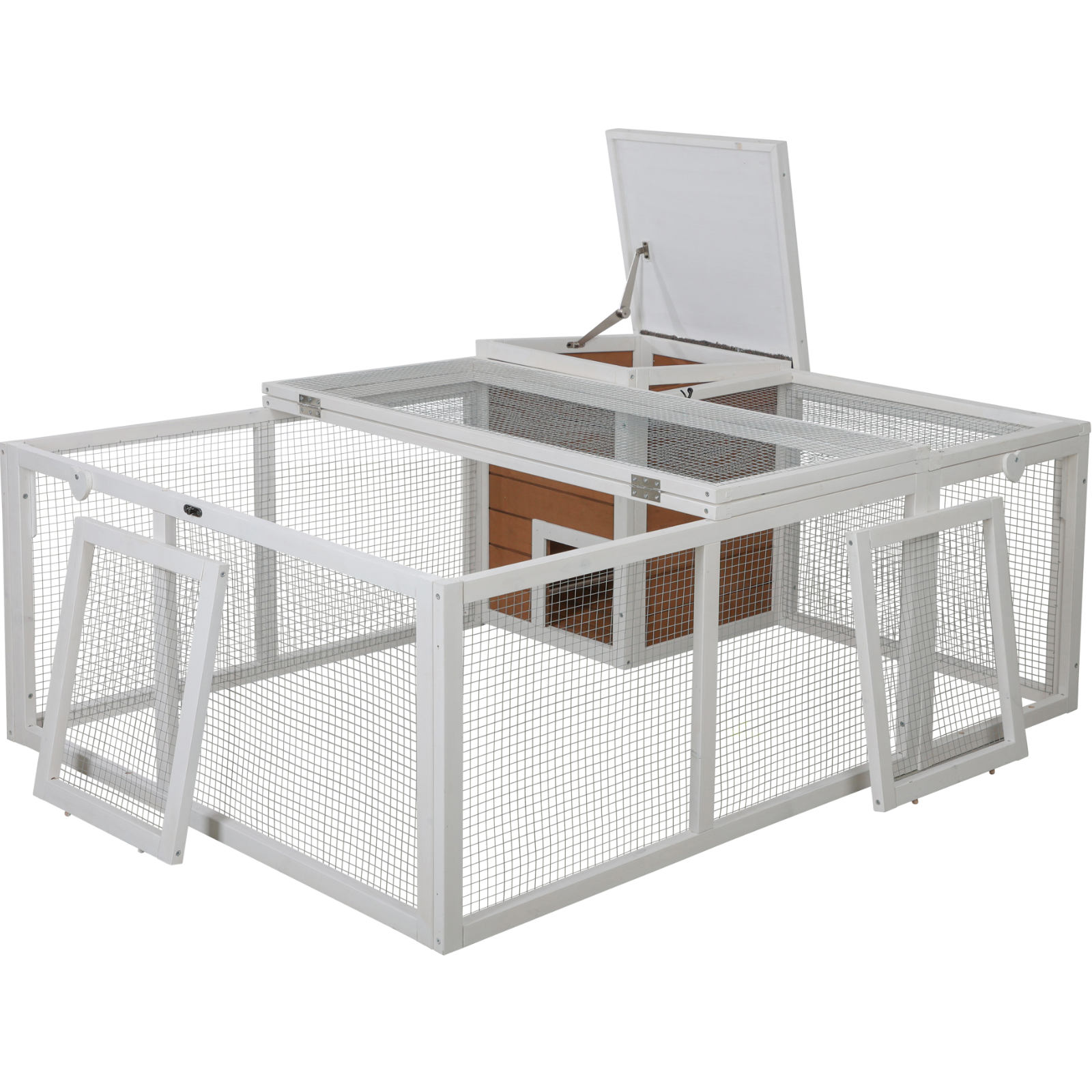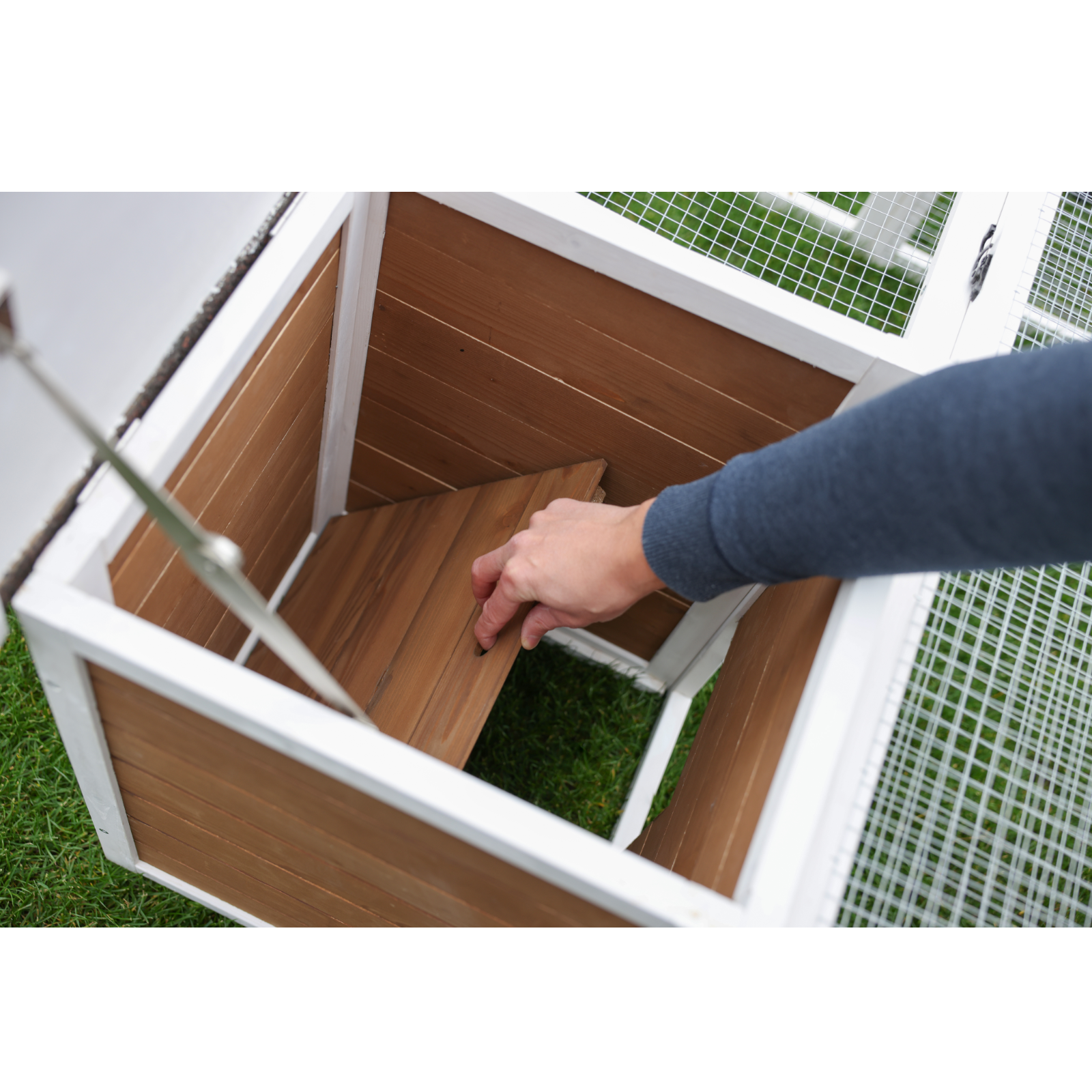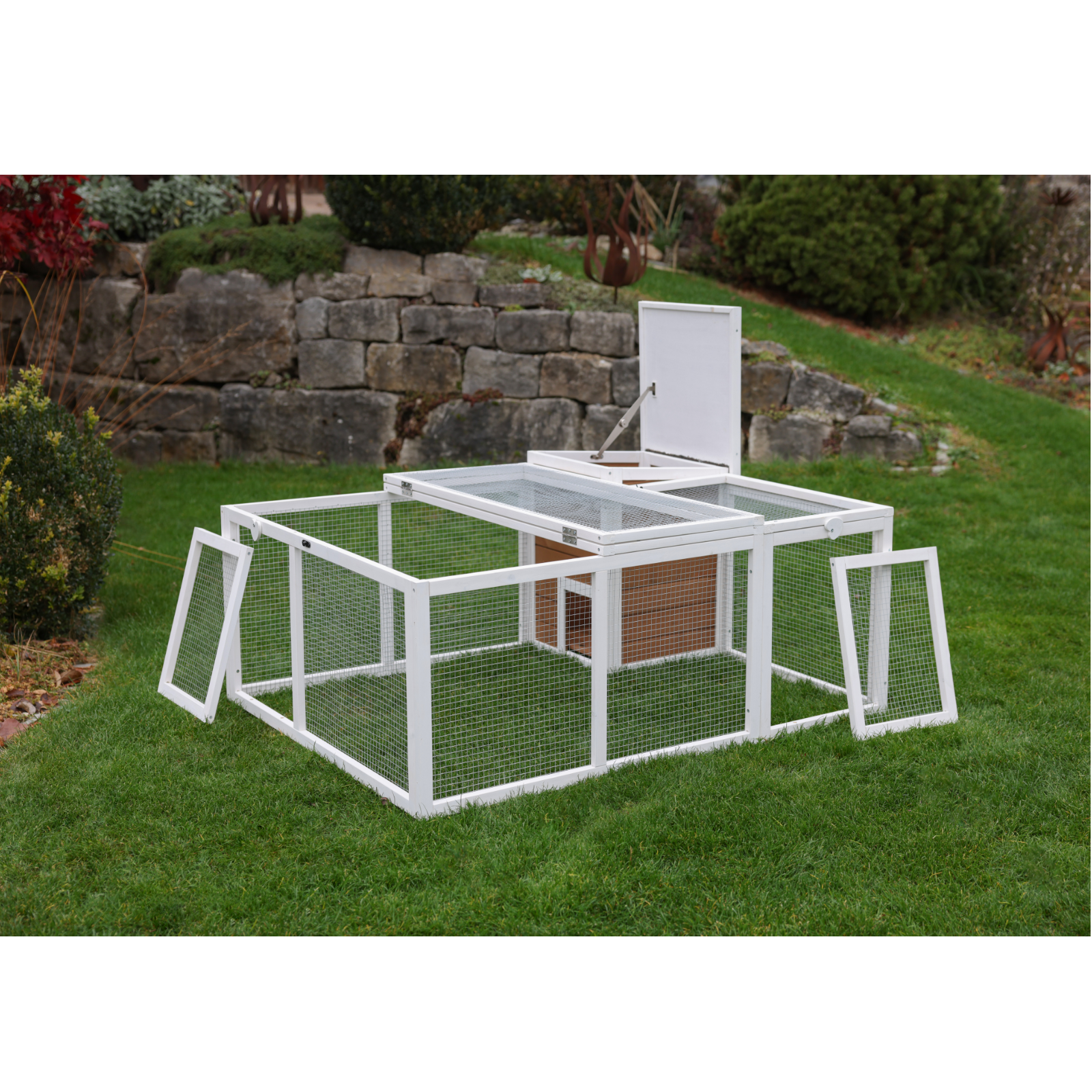 • Gitterdach des Auslaufs und Dach des Unterschlupfhaus können von oben geöffnet werden