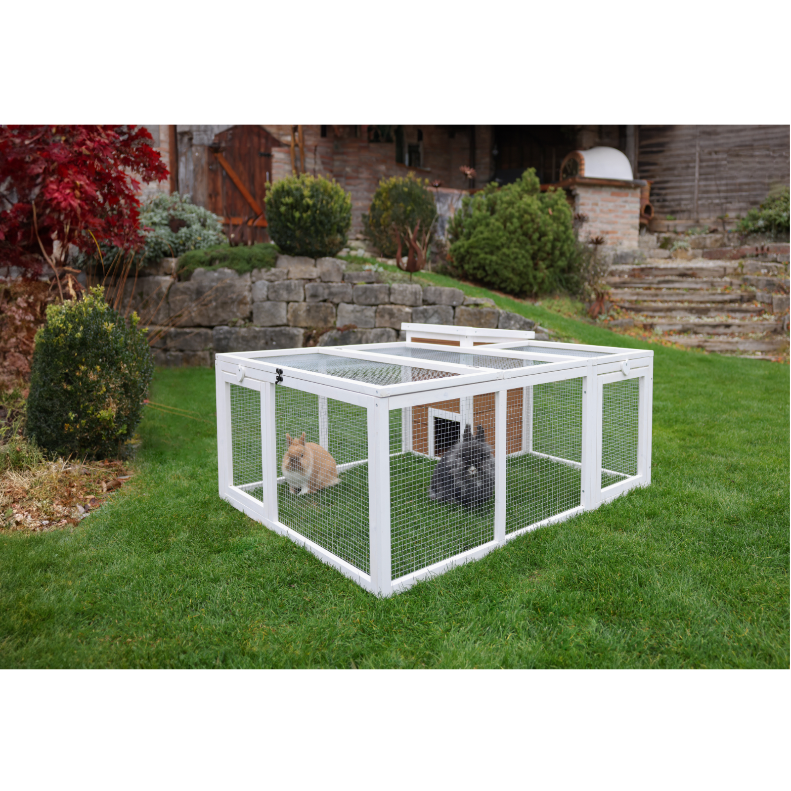 • Öffnungen an Front- und Seitenelement zum Anstellen eines Kaninchenstalls