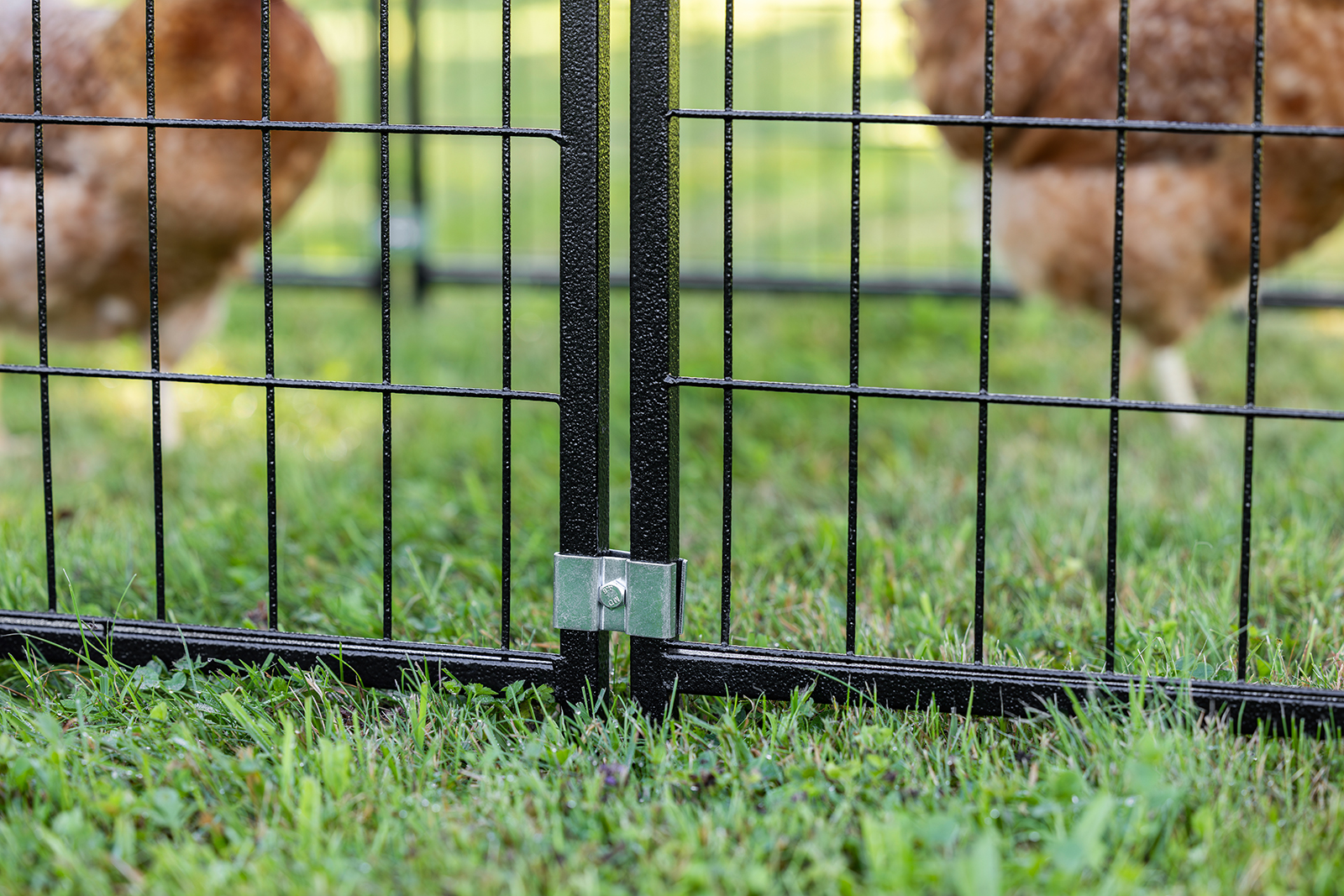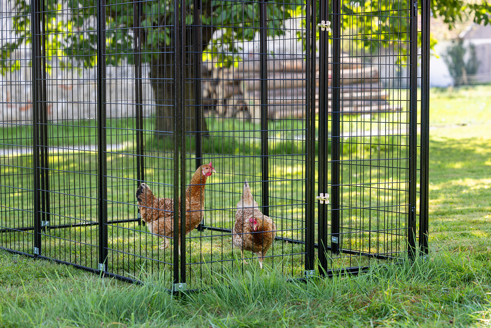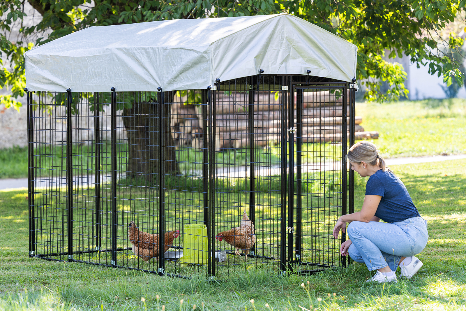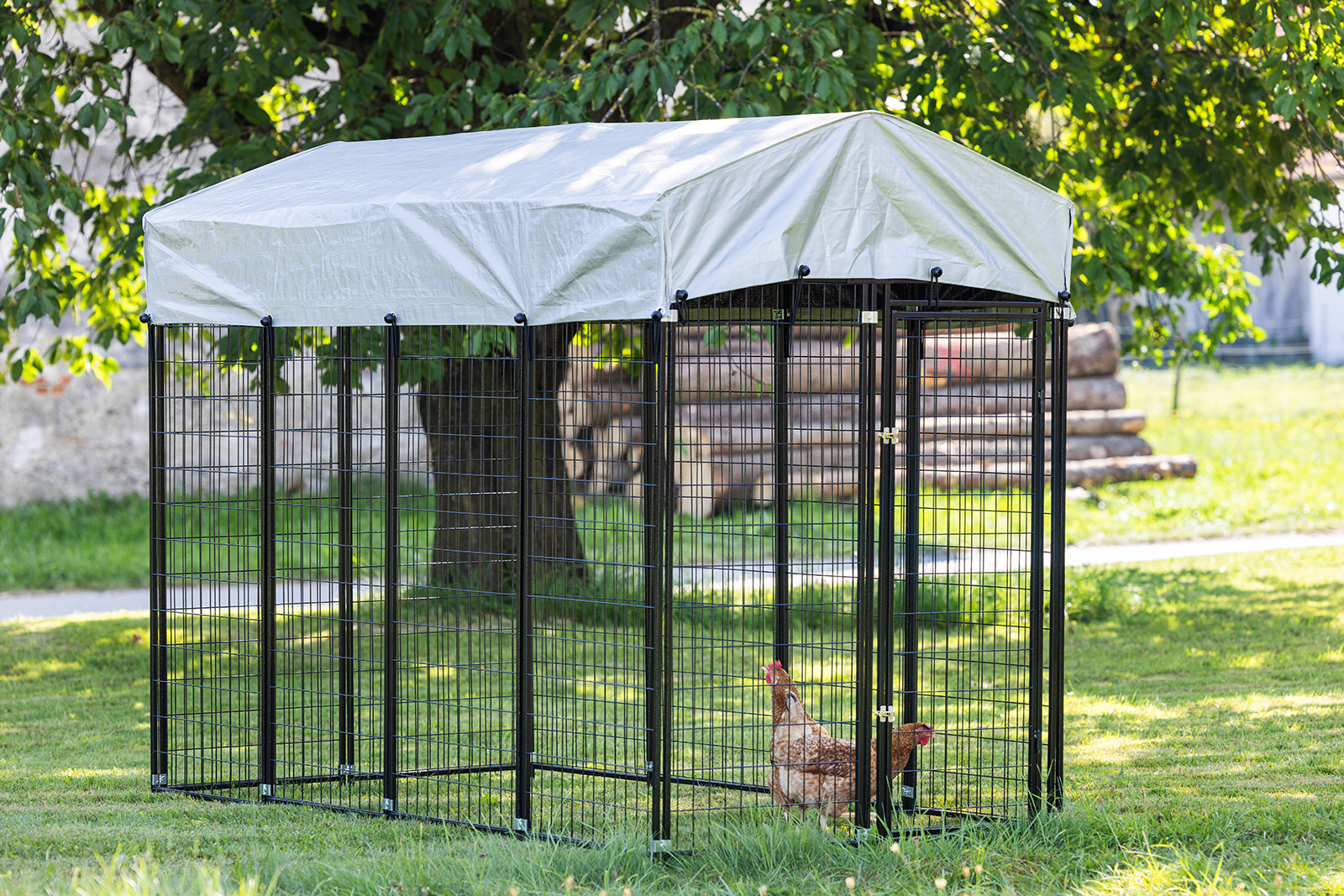 Robustes Freilaufgehege mit stabiler Metallkonstruktion, komplett überdacht, abschließbarer Tür und flexiblem Einsatz - ideal als Freigehege für Hühner und Gänse im Garten.