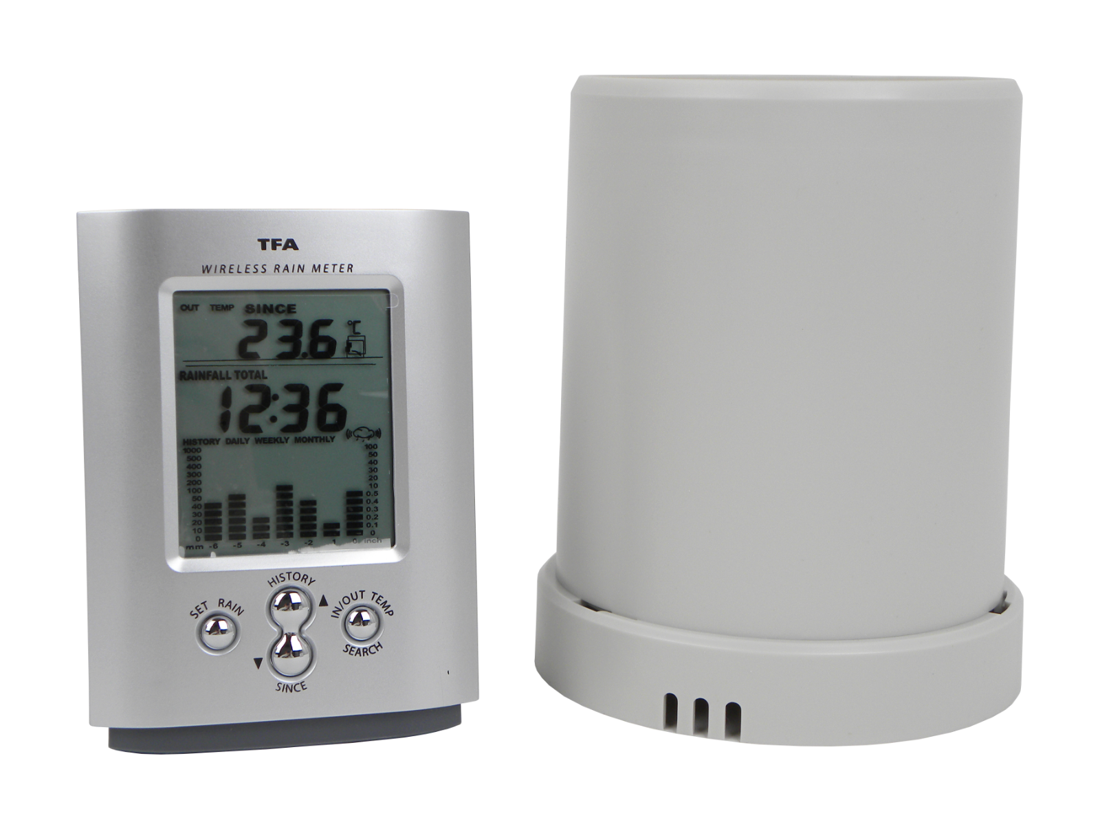 • Kabellose Übertragung der Außentemperatur und Regenmenge (max. 30 m) mit Temperaturtendenzanzeige