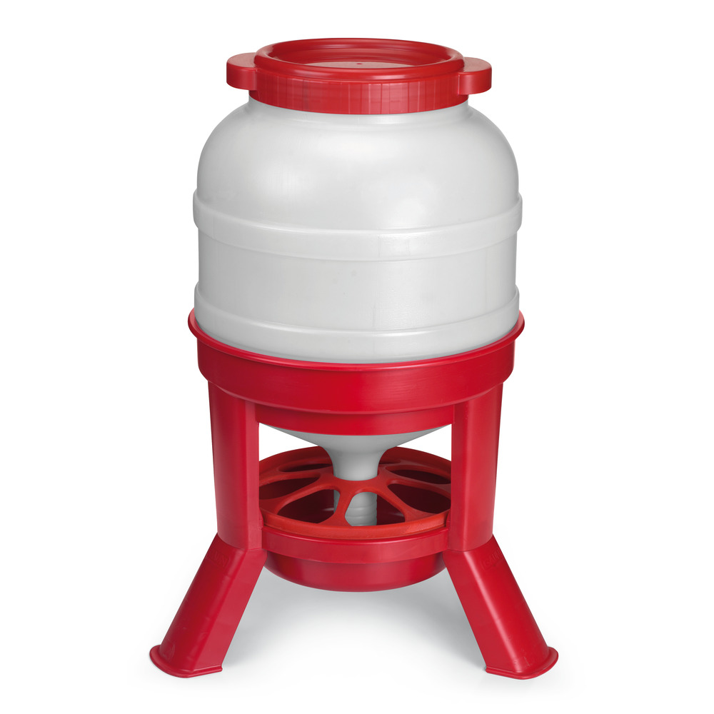 Stabiler und robuster Kunststoffautomat, 30 l, rot/weiß. Der Trichter lässt sich, je nach Futtergröße, abschneiden, damit man einen besseren Zufluss erzielt. Ø 36 cm, Höhe 67 cm. Höhe der Füße 16 cm.
