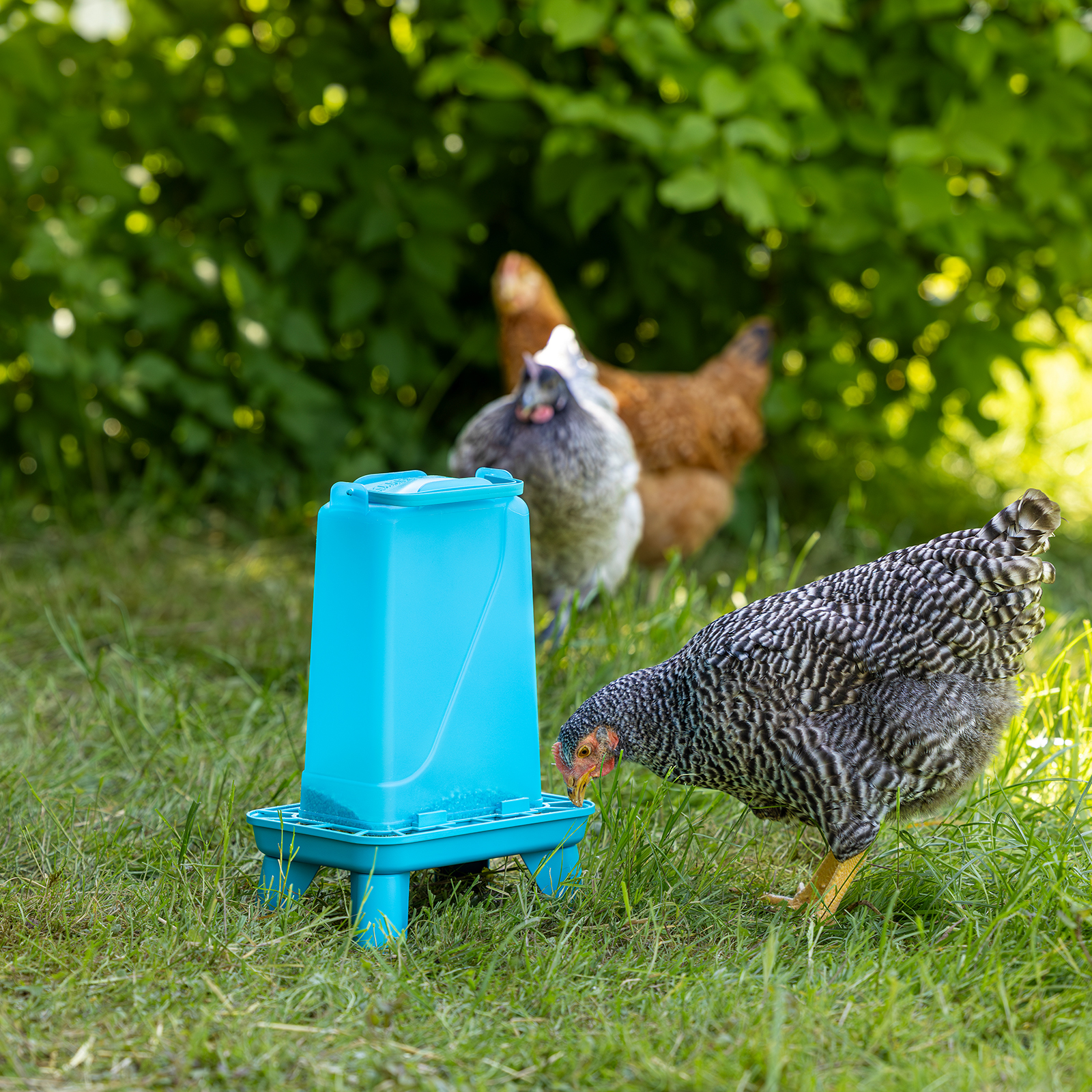 Kunststoff-Hühner-Futterautomat mit 4 Standfüßen.