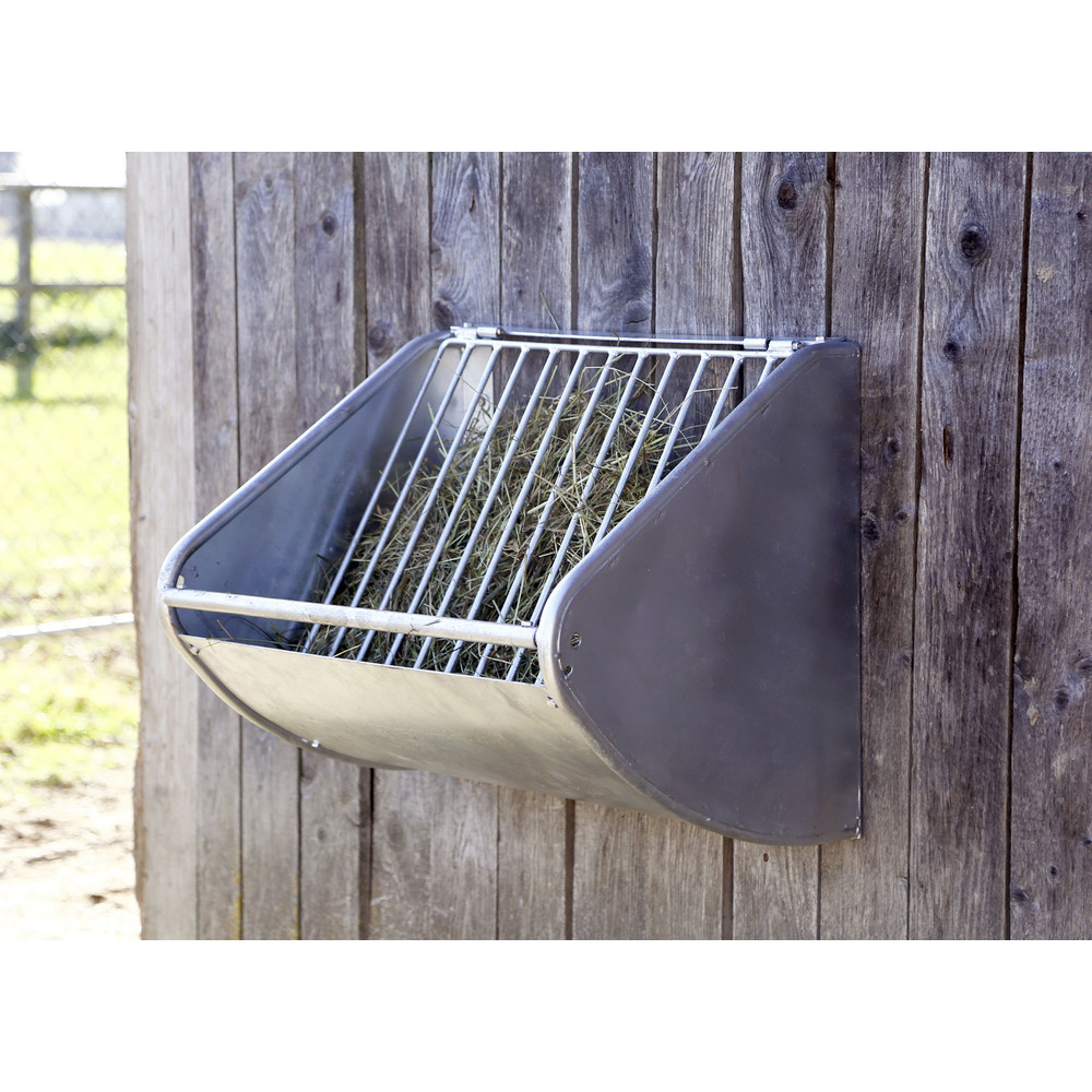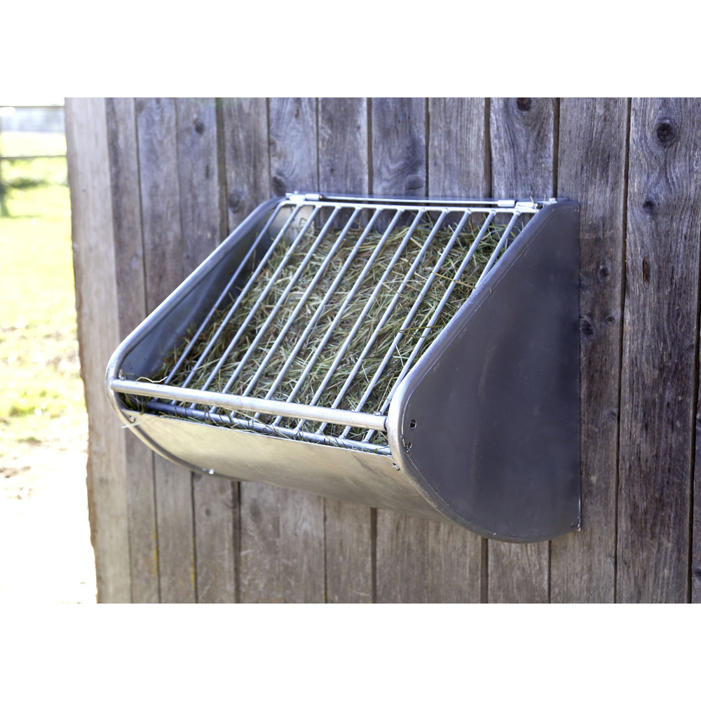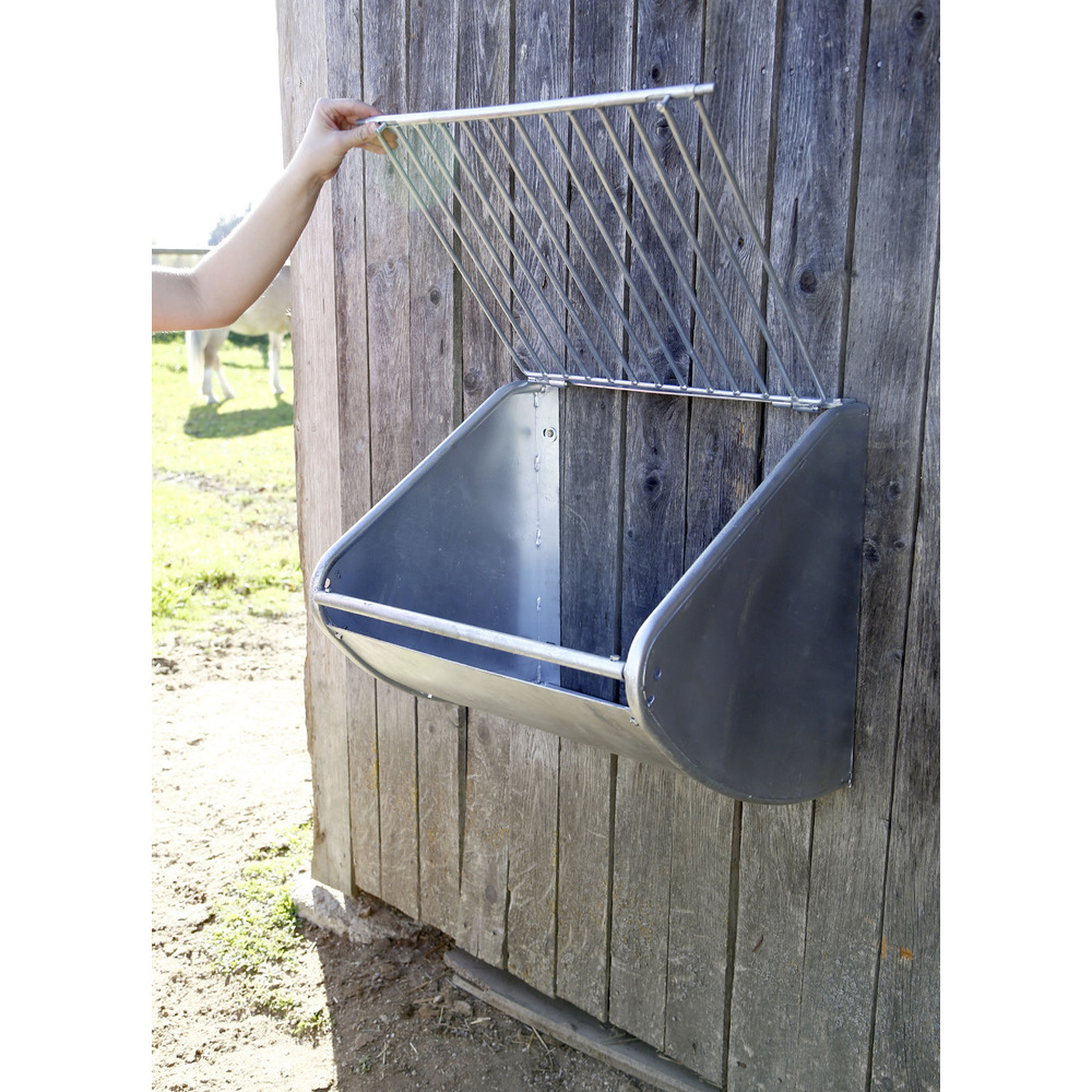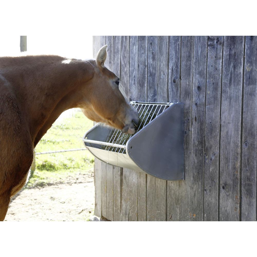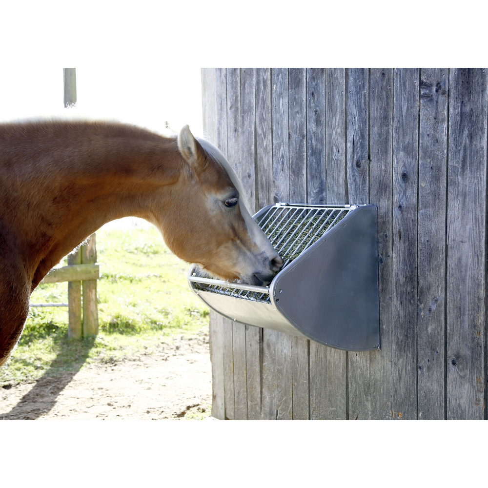 Hochwertige, stabile Futtersparraufe aus verzinktem Metall zur Wandmontage. Die Konstruktion erlaubt dem Pferd ein artgerechtes und langsames Fressen. Beim Fressen wird das Gitter durch die Drehangel gegen das Futter gepresst, das Pferd erhält so kleine Portionen und ist lange beschäftigt. Das Raufutter kann einfach durch Anheben des Gitters von vorne oder bei Bedarf auch von hinten durch eine Öffnung in der Boxenabtrennung befüllt werden. Gewicht: ca. 14 kg. Lieferung erfolgt zerlegt als Bausatz, inkl. Aufbauanleitung, einfache Montage! L x B x H: 60 x 47 x 53 cm