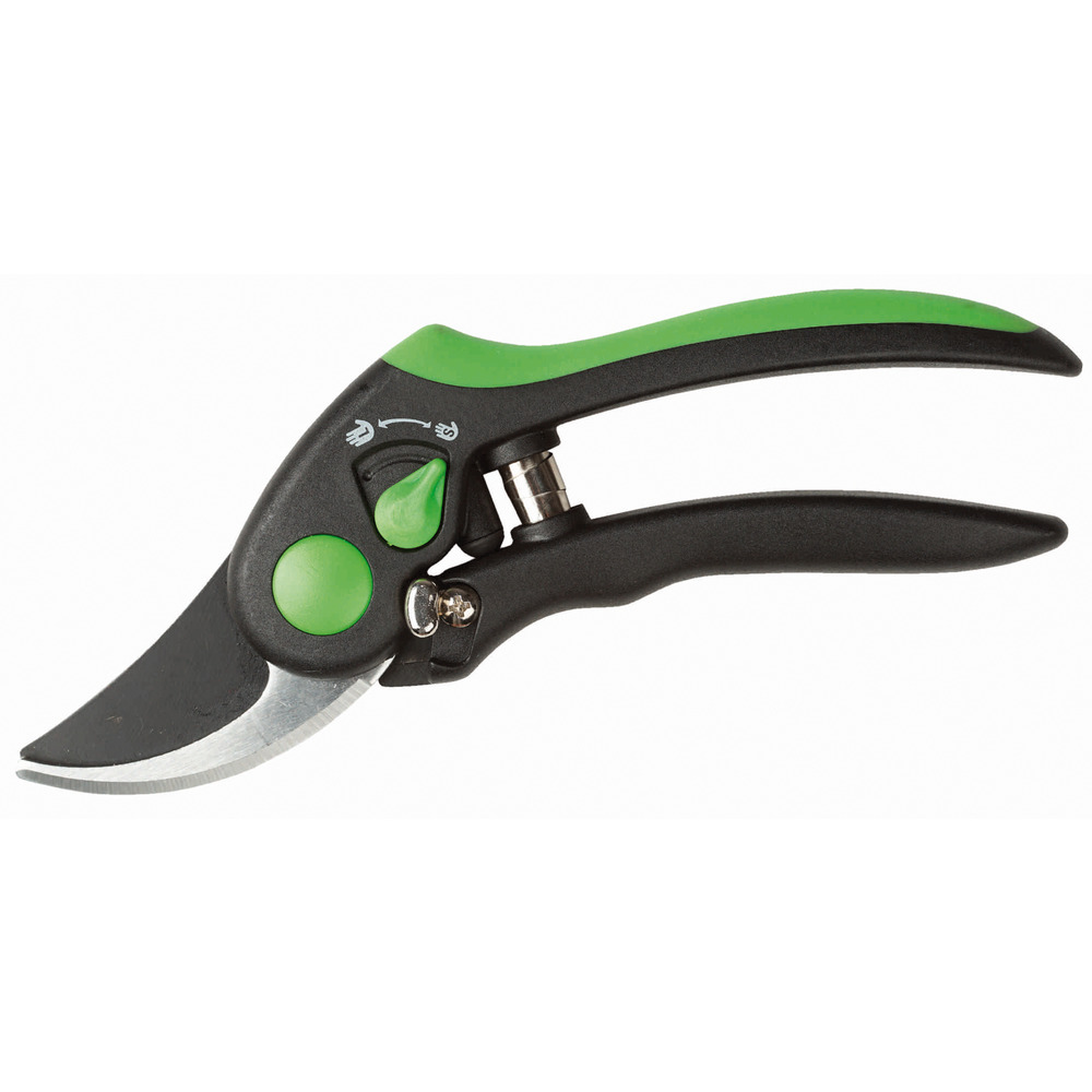 Gartenschere 3200: Vorbeischneidend, Klinge antihaftbeschichtet, Gummipuffer, ergonomisch geformte Griffe, stufenlos einstellbare Handgröße, schneidet bis 18 mm Ø, Länge total: 21 cm.