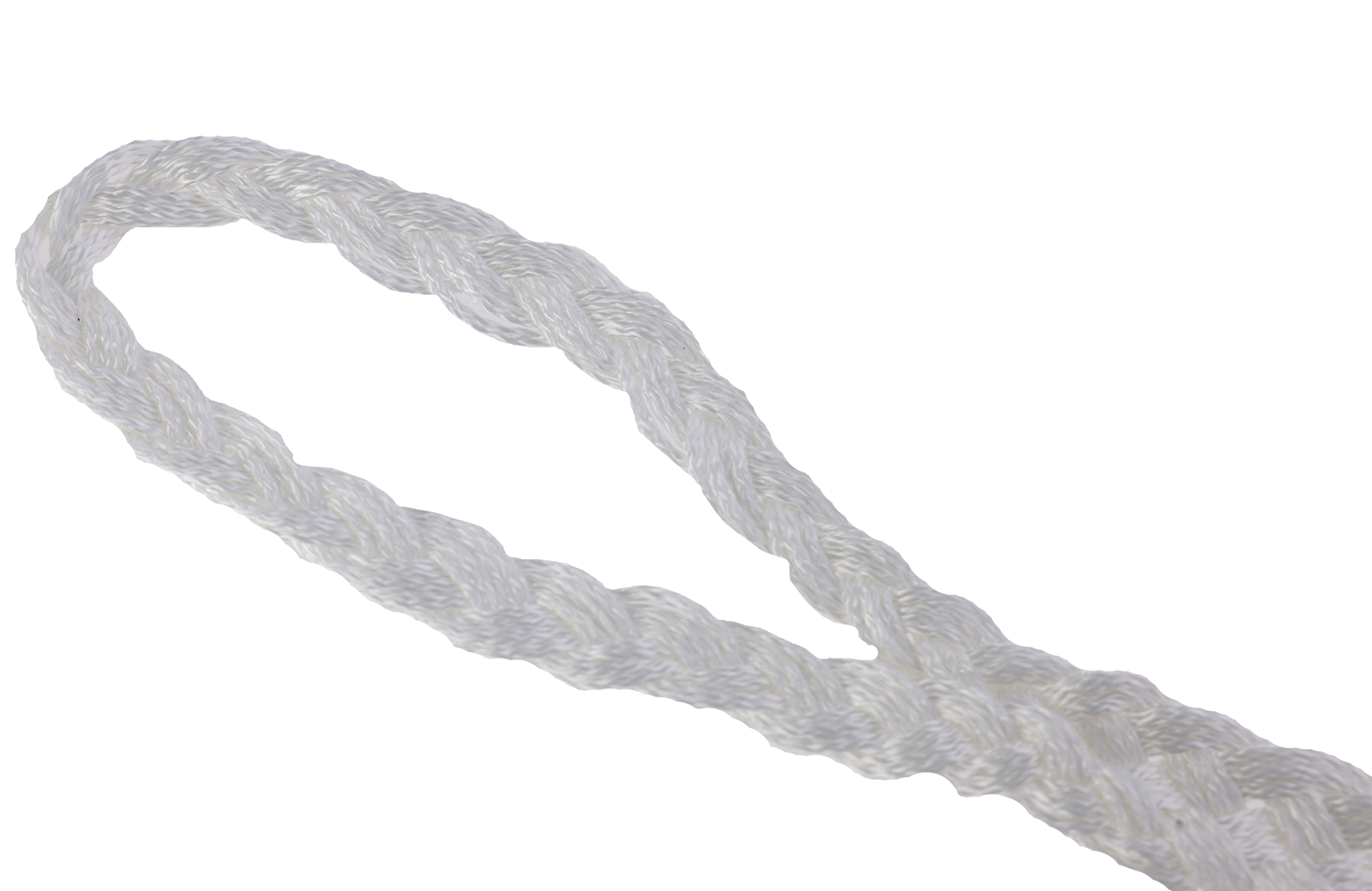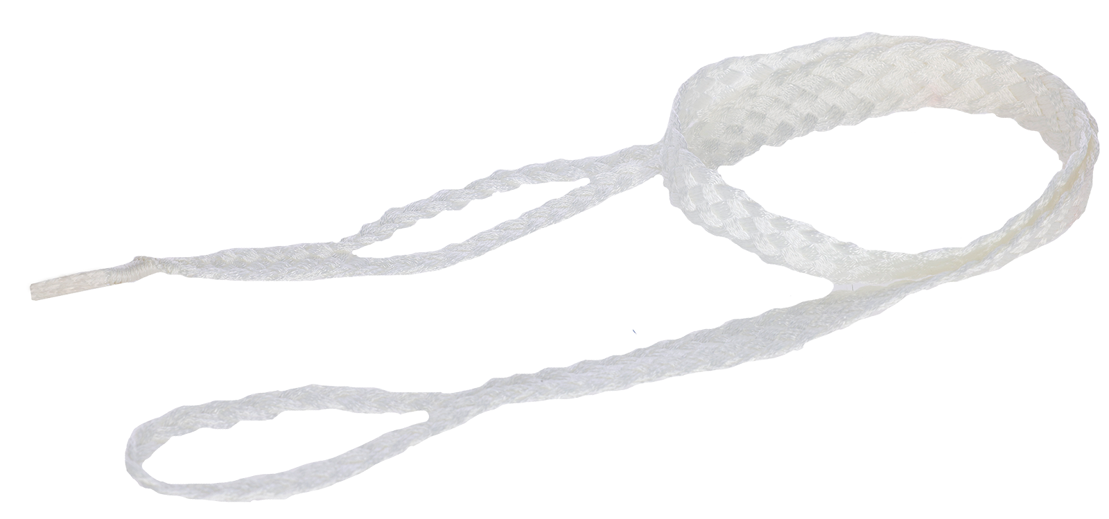 Weißer Geburtsstrick aus Perlon, flach geflochten mit 2 Ösen. Länge 125 cm