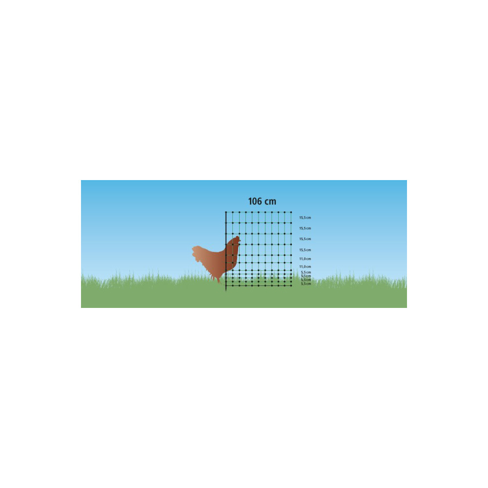 Mit verstärkter Oberlitze, besonders geringe Maschenweite im unteren Bereich des Netzes (5,9 cm).Stabile Kunststoffpfähle mit verzinkter Doppelspitze.
