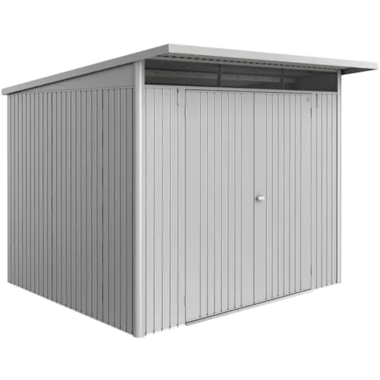 Trendiges Pultdach mit Acrylglasoberlichte und Dachvorsprung.Hergestellt aus hochwertigen verzinktem Stahlblech, Beschläge und Schrauben aus Edelstahl.Einfaches Befüllen und Entnehmen von großen Geräten durch Doppeltür.Das Modell ECO bietet höchste Qualität bei günstigen Preis durch den Entfall von serienmäßigen Zubehör.Selbstverständlich nach Bedarf optional erhältlich.Technische Daten:Außenmaße: 260 x 260 x 218 cmInnenmaße: 252 x 212 x 209 cmInnenfläche: 5,34 m²Fundamentmaß: 257 x 217 B x TEigengewicht: 185 KgFarbe: Silber - Metallic