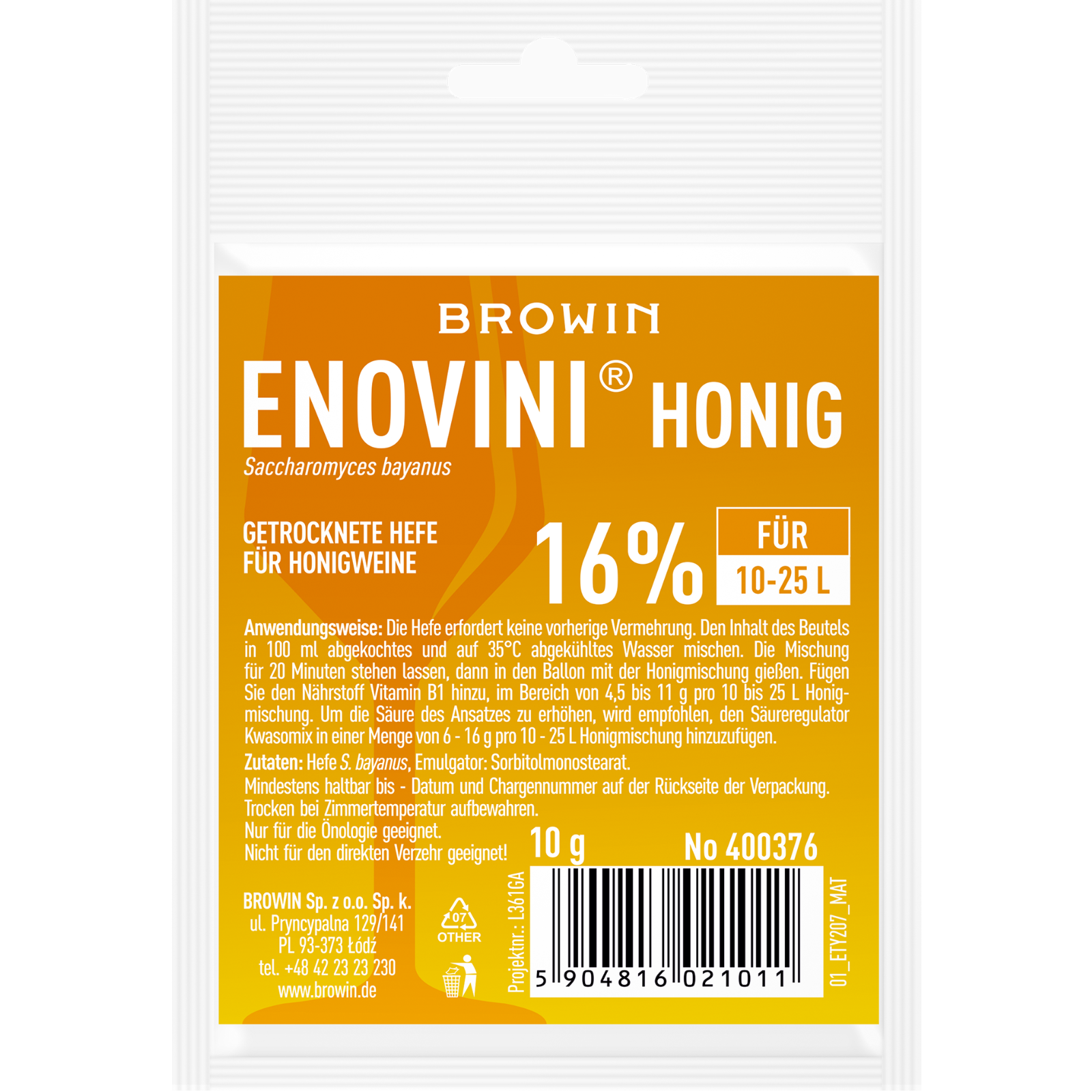Getrocknete Hefe für honigweine Enovini Honig 10g.weist die erhöhte Toleranz für hohe Konzentration des Zuckers und Alkohol auf.Charakterisiert sich durch die niedrige Produktion der flüchtigen Säuren, Sulfite und Acetaldehyd.Anwendungsweise:Die Hefe erfordert keine vorläufige Vermehrung.Den Inhalt der Packung soll man in 100 ml gekochtes und bis zur Temperatur 35°C gekühltes Wasser lösen.Füge Nährboden mit Vitamine B1 hinzu, in der Menge 4,5-11 g/ 10-25 L Maische.Zum Zweck der Senkung von PH empfiehlt man das Hinzufügen von Säureregler in der Menge 18-46 g für 10-25 L Honigmaische.Um den Säuregehalt der Maische zu erhöhen, empfiehlt es sich, den Säureregulator von 18-46 g pro 10-25 L Honigmaische hinzuzufügen.Optimaler Säuregehalt zu Beginn der Gärung: 4-4,5 g/L.
