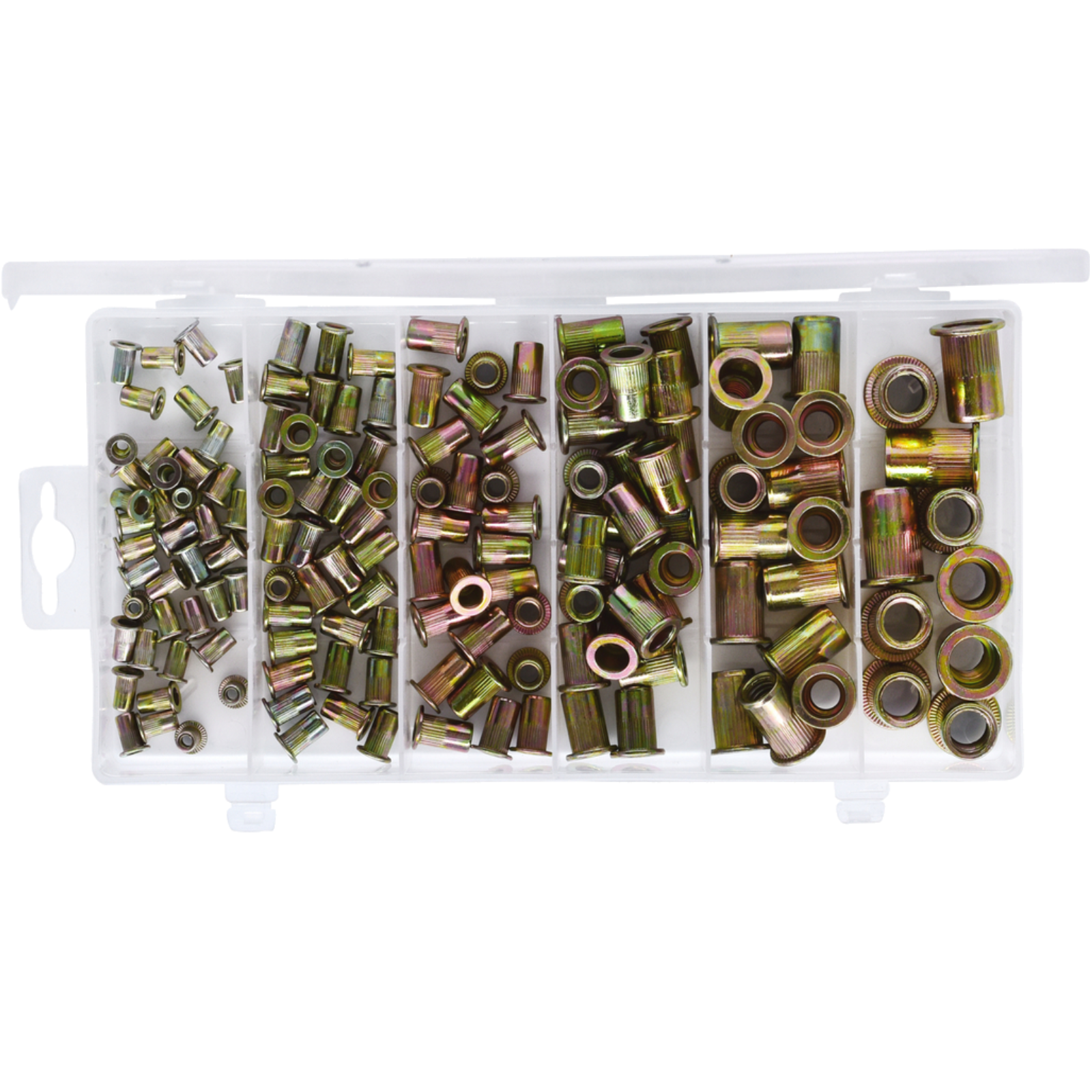 Ein 150-teiliges Sortiment mit Gewindenieten aus StahlM3X9-M10x21 in stabilem Kunststoffkoffer