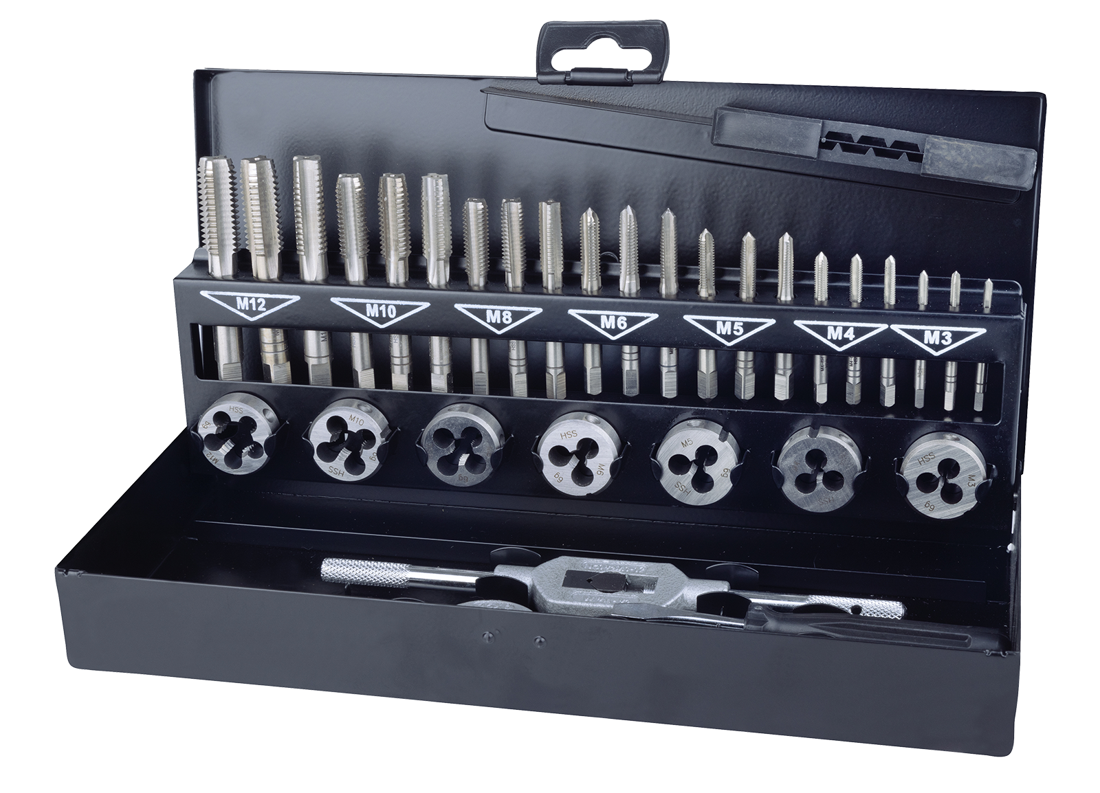 Hochwertiger 31-teiliger HSS Gewindeschneid-Satz aus dem Haus Terrax by Ruko von M3-M12 inkl. aller erforderlichen Schneideisen, Schneideisenhalter, Wendeisen und einem Schraubendreher. Verpackt in praktischer Stahlblech-Aufbewahrungskassette.