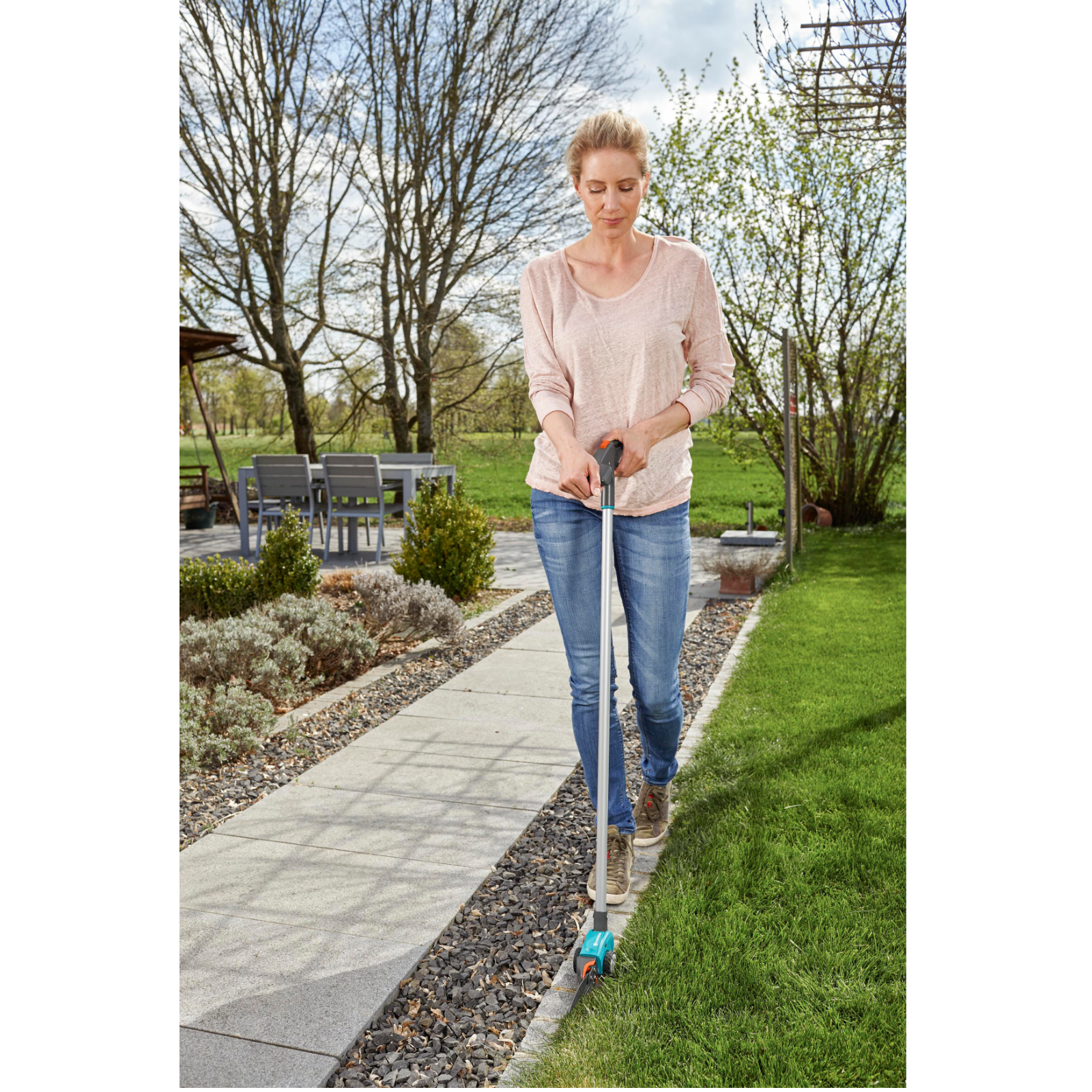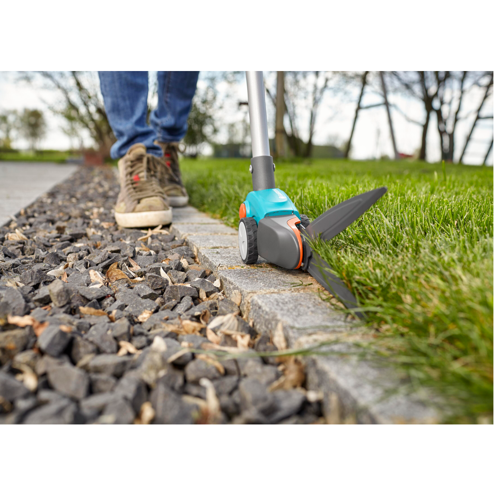 Rückenschonende Rasenkantenpflege in aufrechter Position. Die langstielige Comfort Grasschere von GARDENA überzeugt durch einen leichten Aluminiumstiel und eine drehbare Messereinheit.