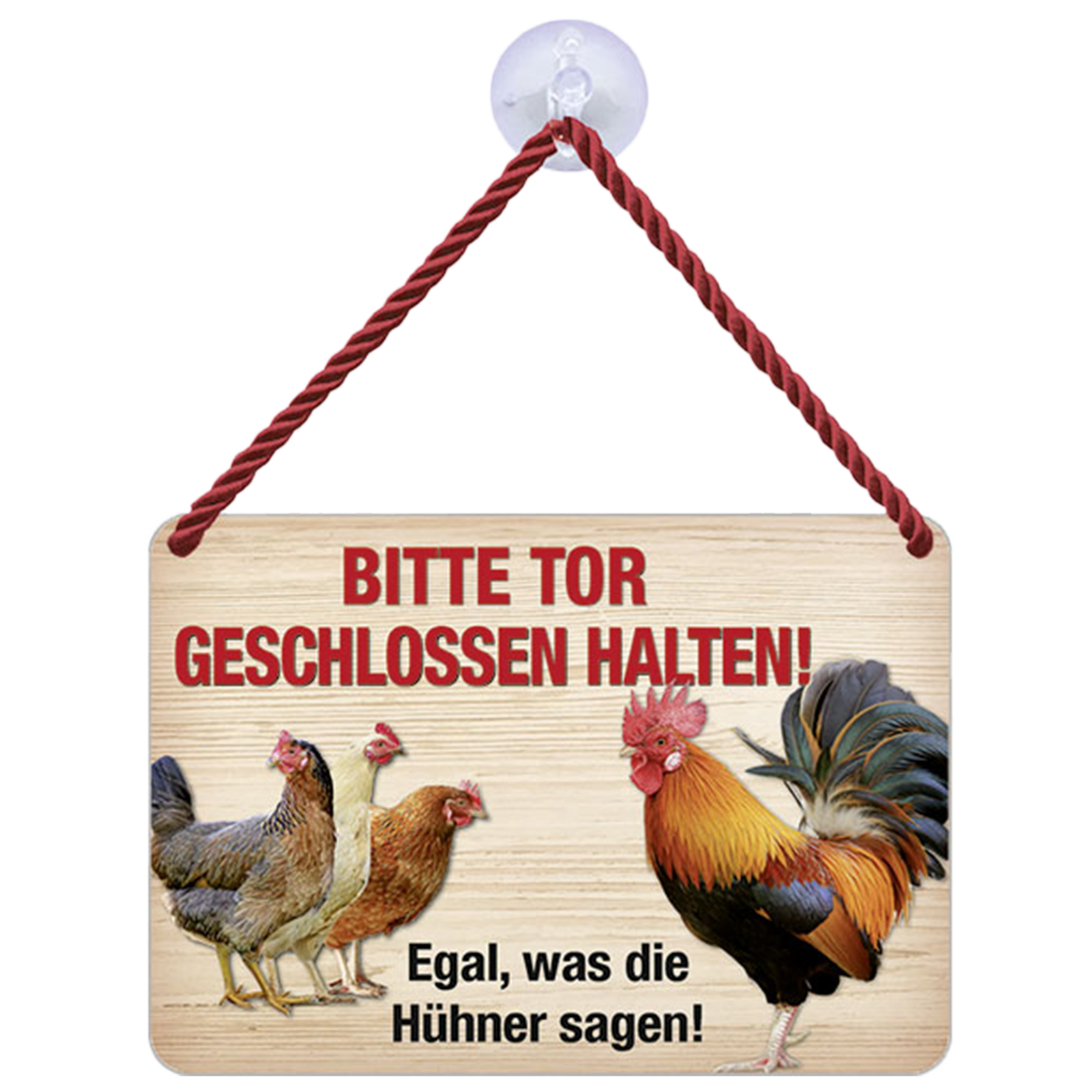 Sie wollen Ihren Hühnerstall sichern, aber mit einem Augenzwinkern? Dann ist unser lustiges Hängeschild Bitte Tor geschlossen halten mit den niedlichen Hühnern genau das Richtige für Sie! Es ist die perfekte Kombination aus notwendiger Sicherheitsmaßnahme und charmantem Hingucker, der jedem ein Lächeln entlockt.Maße: 16,5cm x 11,50cm.
