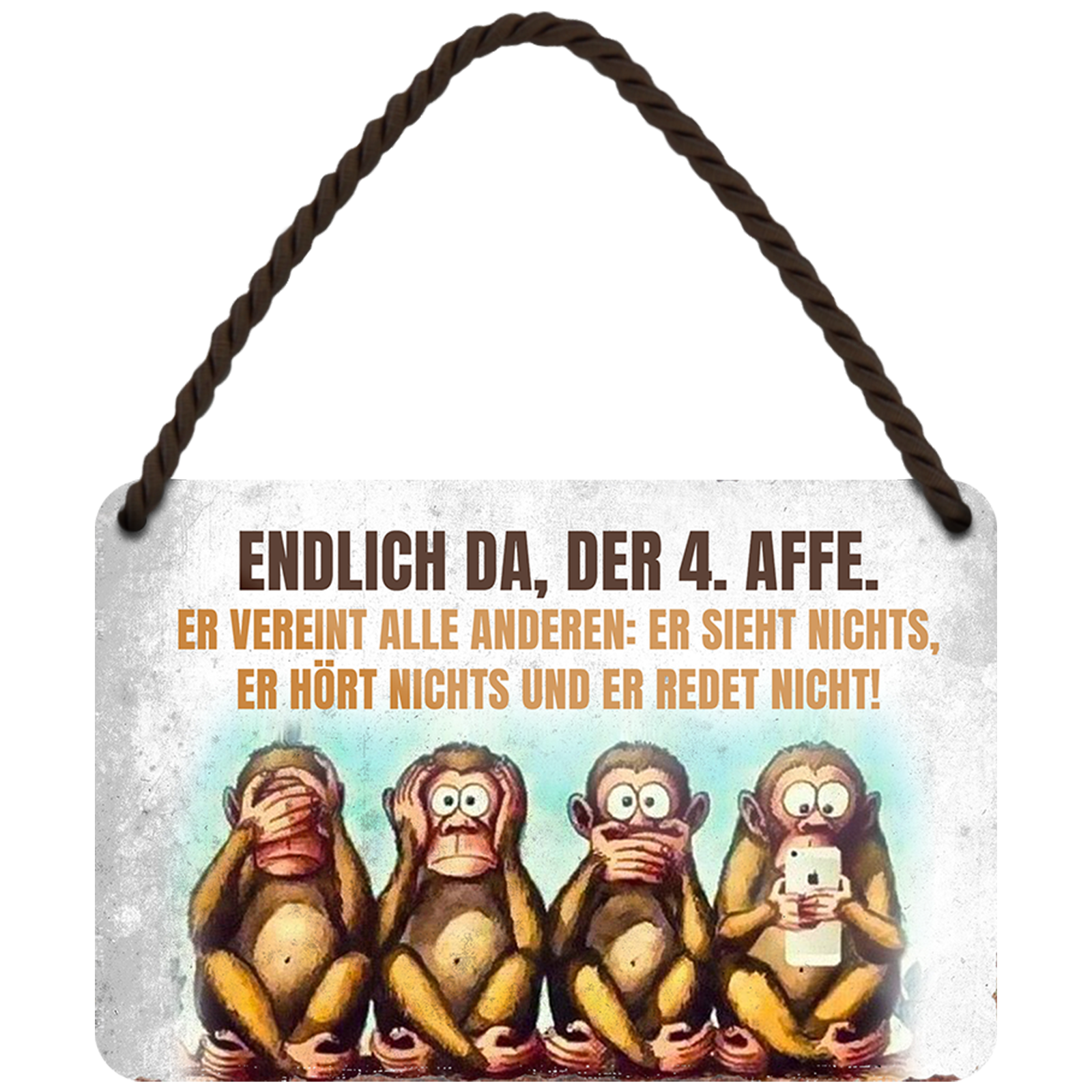 Sie kennen die drei Affen: Nichts sehen, nichts hören, nichts sagen. Aber in unserer modernen Zeit gibt es einen vierten Affen, der allgegenwärtig ist: Er starrt gebannt auf sein Handy.Unser humorvolles Hängeschild Der 4. Affe – Handy ist eine witzige und zugleich nachdenkliche Dekoration, die diese neue Realität auf den Punkt bringt. Es ist das perfekte Accessoire für alle, die das Thema Handysucht mit einem Augenzwinkern betrachten und einen Ort schaffen möchten, an dem das Smartphone auch mal beiseitegelegt werden kann.Maße: 18x20cm.