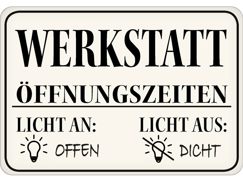 Kultiges Hängeschild aus Metall mit Prägung „Werkstatt – Öffnungszeiten“.Mit färbiger Kordel und Saugnapfhacken zur einfachen Montage.Ein Blickfang in ihrer Werkstätte. Maße: 16,5 x 11,5 cm