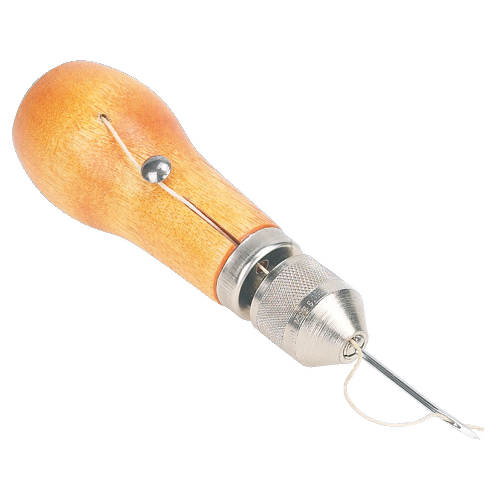 Spezial Nähmaschine (Ahle) für Leder, komplett mit 2 Stück Nadeln (1x gebogen, 1x gerade) und Garn (1 Spule, grobes, gewachstes Polyestergarn im hohlen Griff).Zum Nähen von Leder, Segeltuch und ähnlichen Materialien. Die Nähahle hat eine Spule im hohlen Holzgriff. Wenn sie nicht gebraucht wird, können die Nadeln verletzungssicher und unverlierbar befestigt werden.