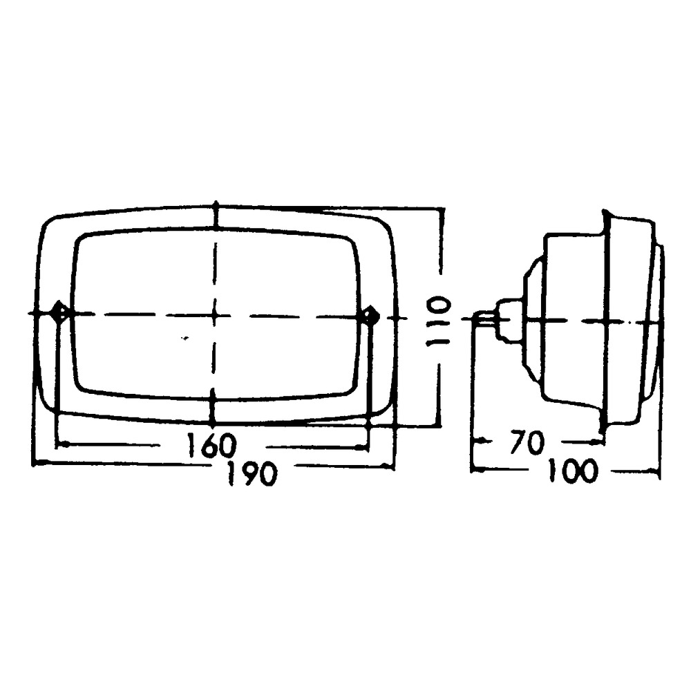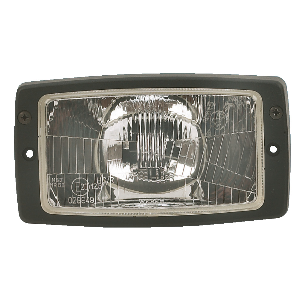 12 V, H4 mit Begrenzungslicht. Passend teilweise auch für Steyr Serie 80, 900 und Lindner ab `99. Asymetrisches Licht, Glasrahmen aus schwarzem Kunststoff, Reflektor und Streuscheibe zusammen verklebt, Streuscheibe Einstellwinkel +/- 4°, Maße: 182x102 mm, Schraubabstand: 160 mm, Einbauöffnung: 145x90 mm