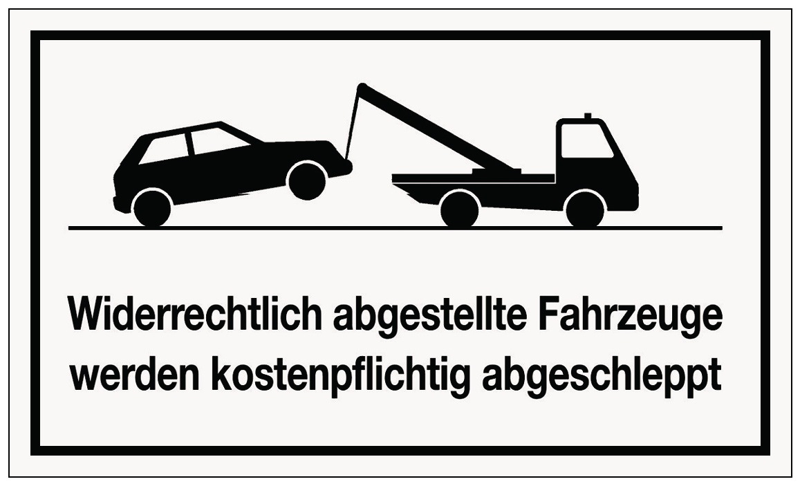 Weiße Kunststofftafel mit schwarzem Aufdruck: Widerrechtlich abgestellte Fahrzeuge werden kostenpflichtig abgeschleppt