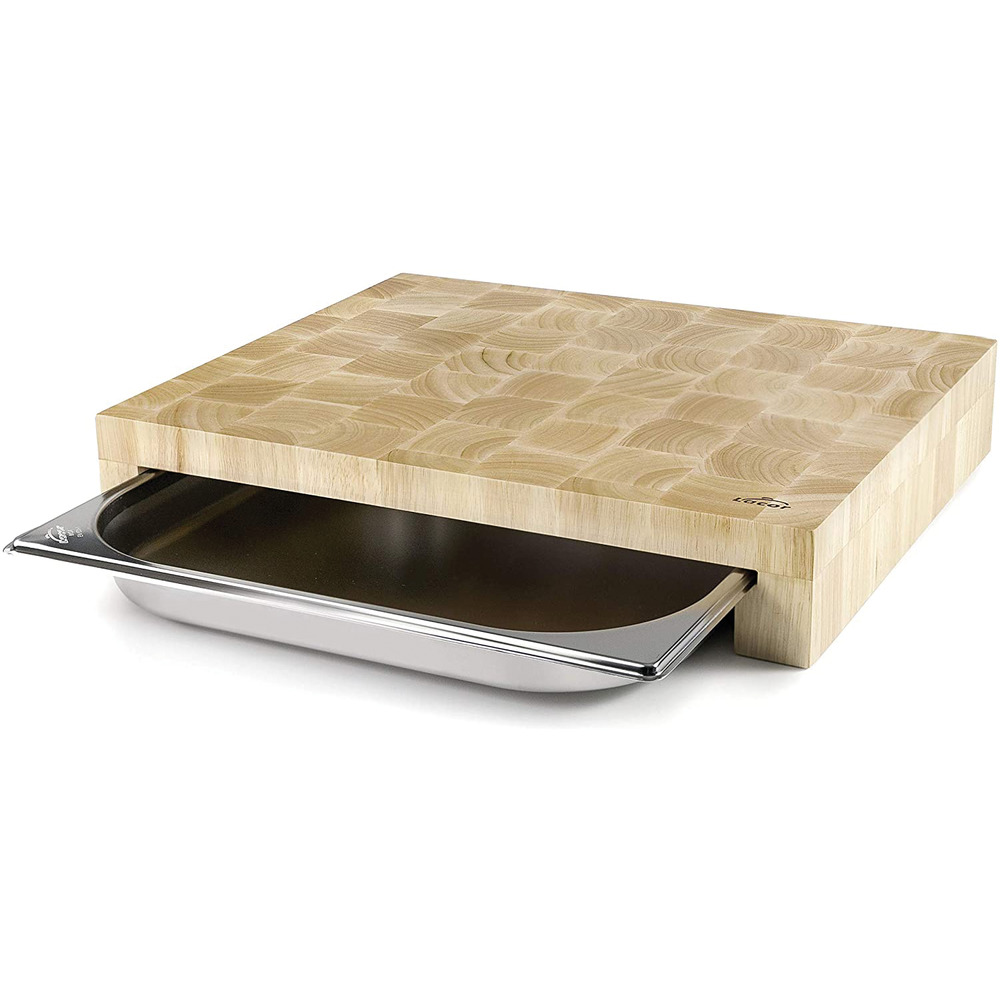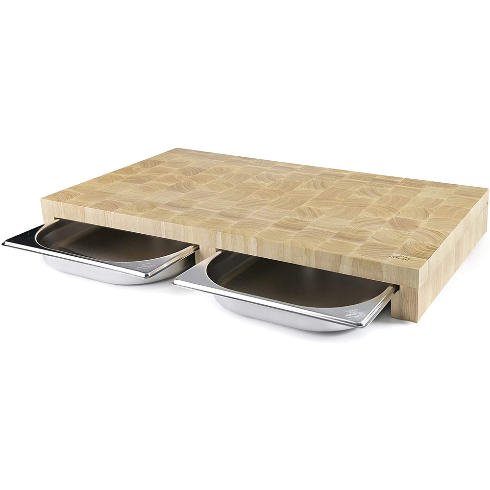 Hochwertiges Schneidbrett aus Gummibaumholz. Die praktischen integrierten GN-Behälter aus Edelstahl ermöglichen das einfache Auffangen von z. B. geschnittenem Gemüse, Obst, Fleisch oder Fisch.