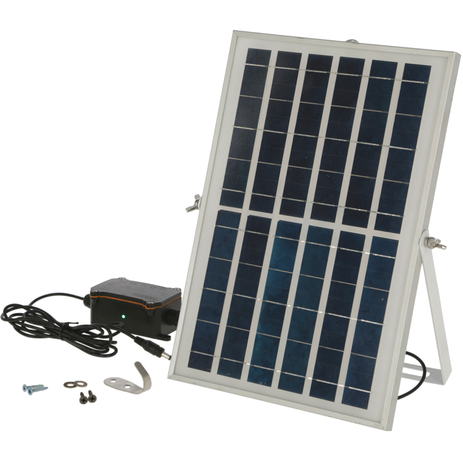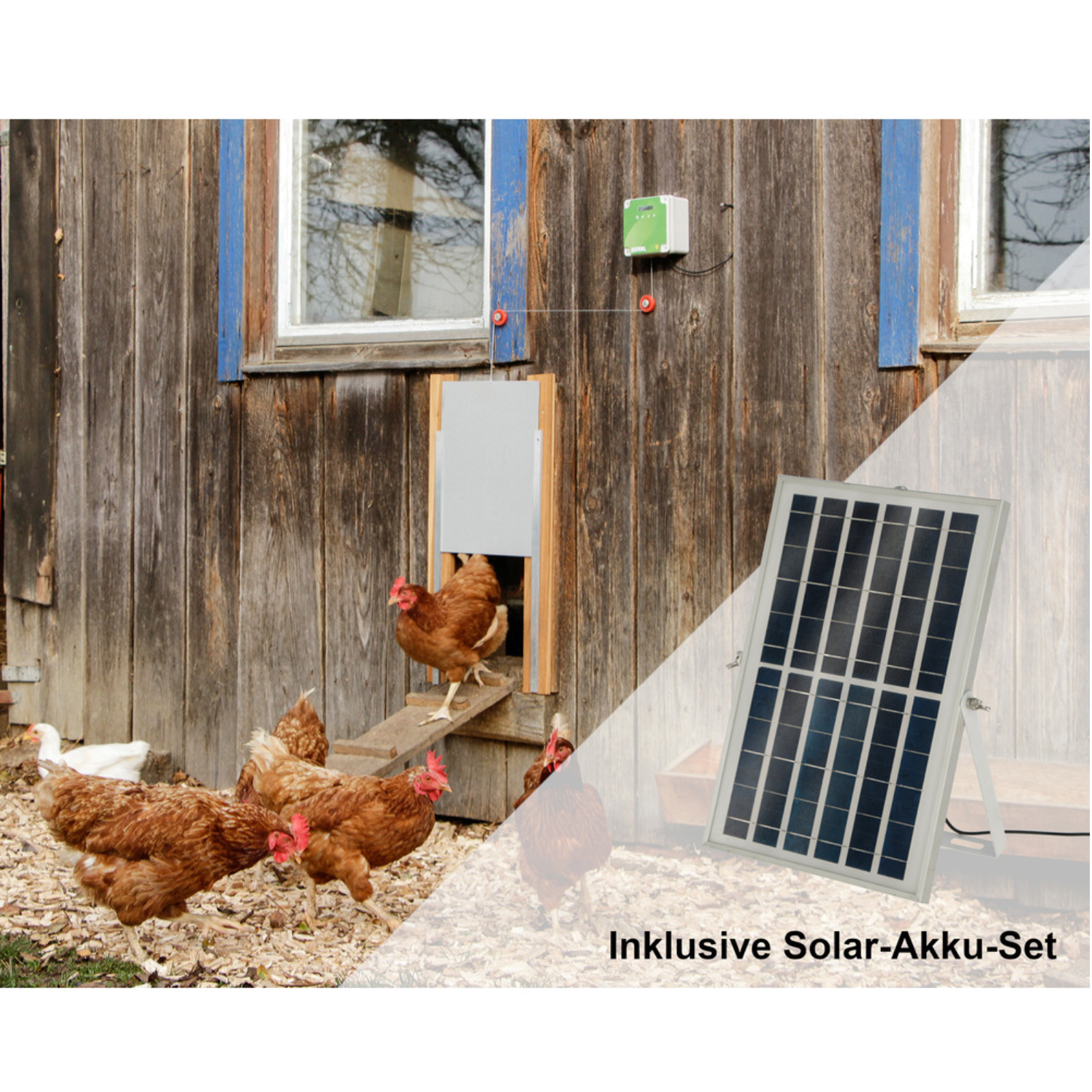 Das praktische automatische Hühnertür Set -jetzt inklusive tollem Solar-Akku-Set!Dieautomatische Hühnertür verfügt über mehrere Funktionen zum Öffnen/Schließen des Schiebers: Tageslichtabhängige Steuerung mit Lichtsensor, zeitabhängige Steuerung, manuelle Steuerung, am Gerät oder über angeschlossenen Taster.Es ist sowohl Batterie- als auch Netzbetrieb möglich, und mit diesem Set auch eine völlig energieautarke Ladung mittels Solarenergie!Bereits 7 Sonnentage pro Jahr reichen für einen ungefährdeten Dauerbetrieb!LED zeigt an, wenn die Sonneneinstrahlung für den Ladevorgang ausreichend ist.Lieferumfang:Steuerung mit integriertem Motor und Seilzug, Schiebetür (43 x 40 cm) mit Führungsschienen,Netzteil, Batterien, Lichtsensor, Umlenkrollen-Set, Solar-Akku-Set mit 10W Solarmodul (LxBxH: 34,7x23,5x1,7cm),Montagekit für eine variable Anbringung des Solarmoduls, 5 m Anschlusskabel.Spar-Set bestehend aus den Artikelnummern 123495 und 118580Set für BIO-Betriebe geeignet! -> Türgröße mind. 40 x 35 cm