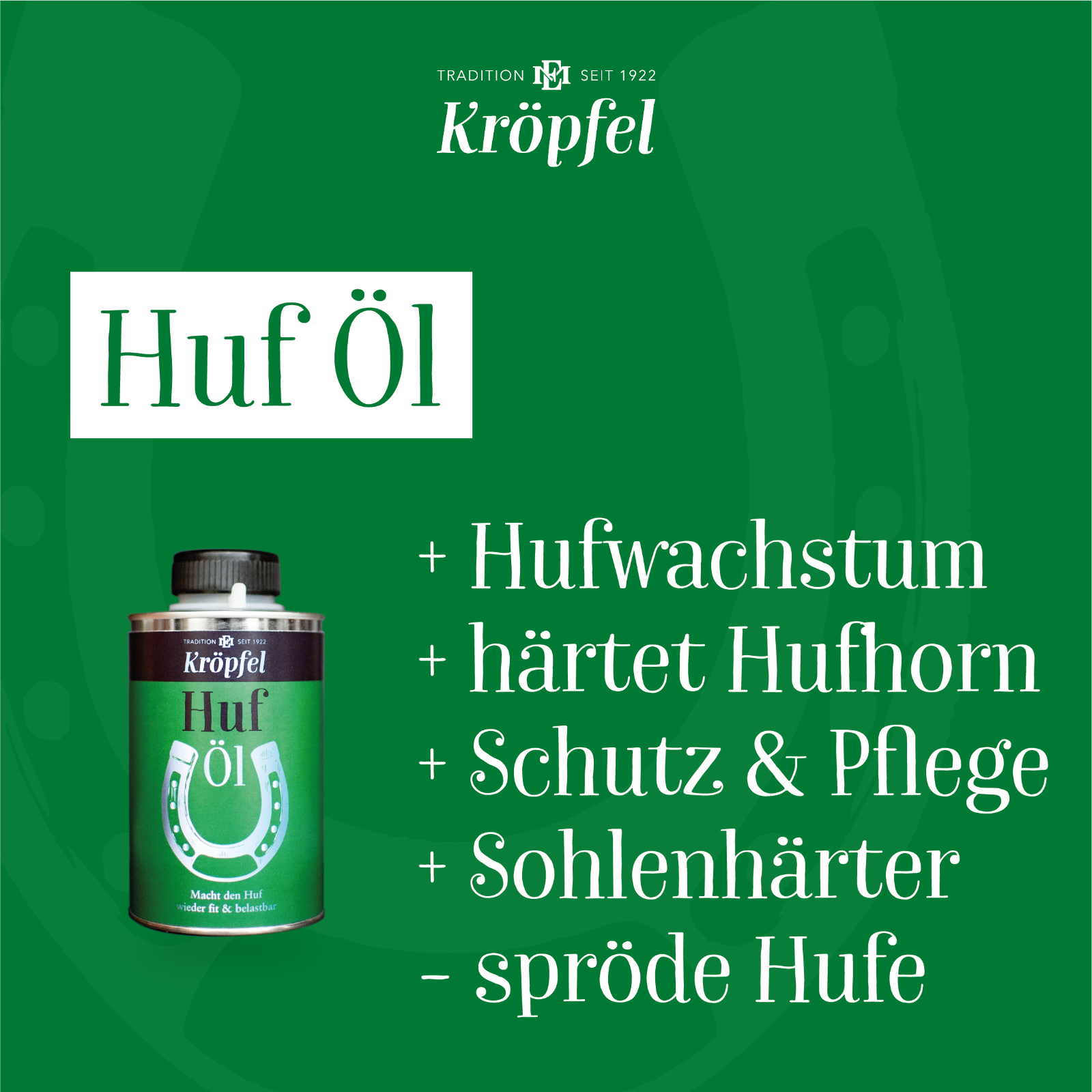 Hufe sind meist zu trocken, dadurch geht die so wichtige Hufelastizität verloren.Mit dem Hufpflegeöl pflegen und schützen sie den Huf ihres Pferdes.Das Kröpfel Huföl kann bei jedem gesunden Huf angewendet werden. Der Huf wirdfester und wächst schneller, außerdem bekommt der Huf durch das Öl diebenötigten Nährstoffe.Darüber hinaus ist Hufpflegeöl für Hufe geeignet die zu Strahlfäule neigen.