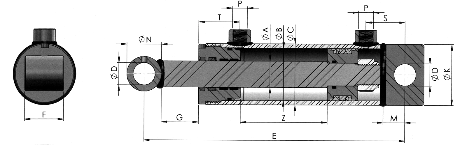SAUGUT Hydraulikzylinder doppeltwirkend mit Querbohrung und Querbuchse Ø30,5 mm, Kolben-Ø B=70 mm, Kolbenstange-Ø A=40 mm