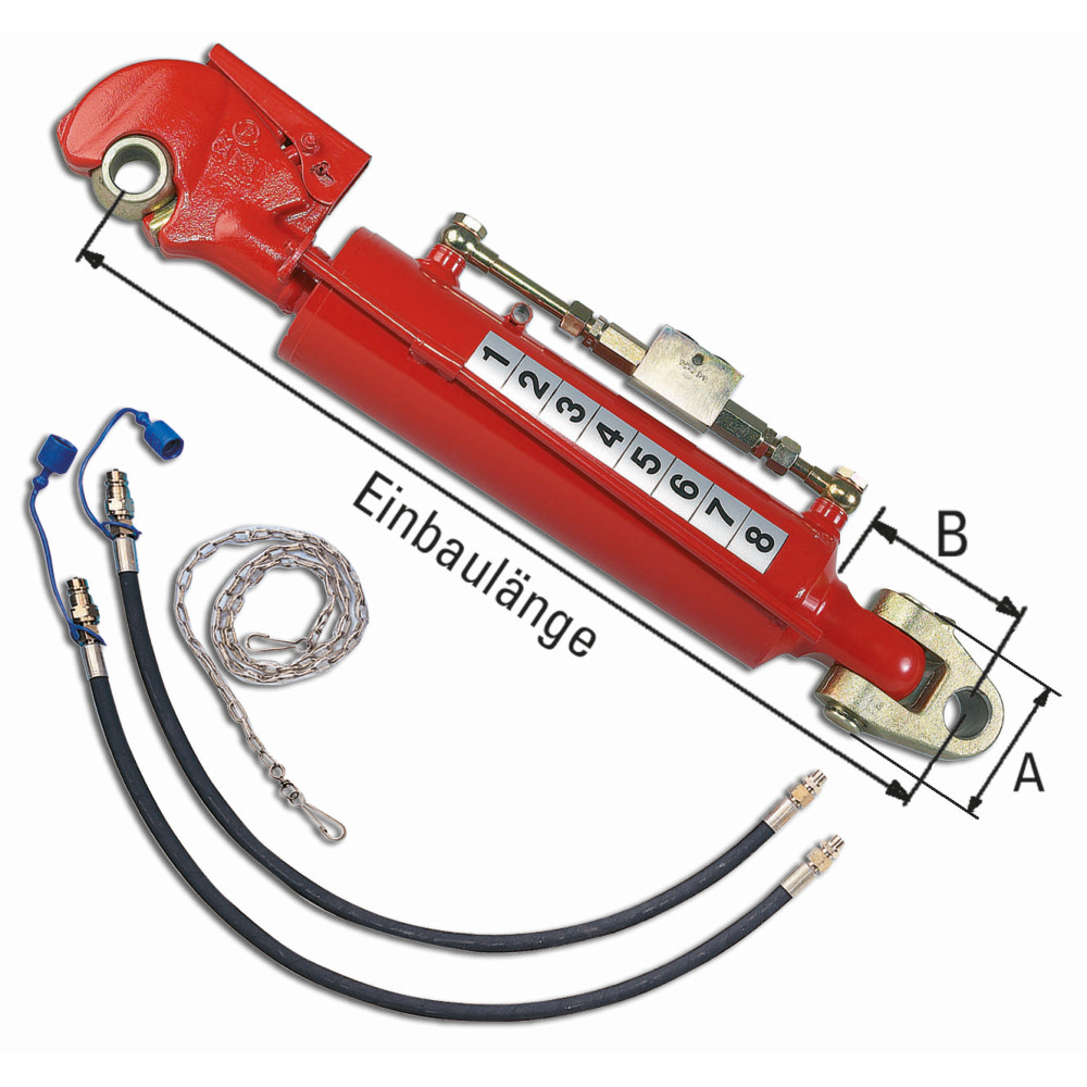 Hydraulischer Oberlenker mit Fanghaken Kat.3 und Gelenkkopfaufnahme. Besonders geeignet für den Anbau schwerer Geräte. Der Oberlenker wird mit einem hydraulisch entsperrbarem Rückschlagventil (Sperrblock) geliefert. Die Anschlussschläuche sind komplett mit Stecker, Staubschutz und dem passendem Einschrauber für den Sperrblock ausgestattet. Die Betätigungskette für den Fanghaken und die Oberlenkerkugel sind im Lieferumfang enthalten.