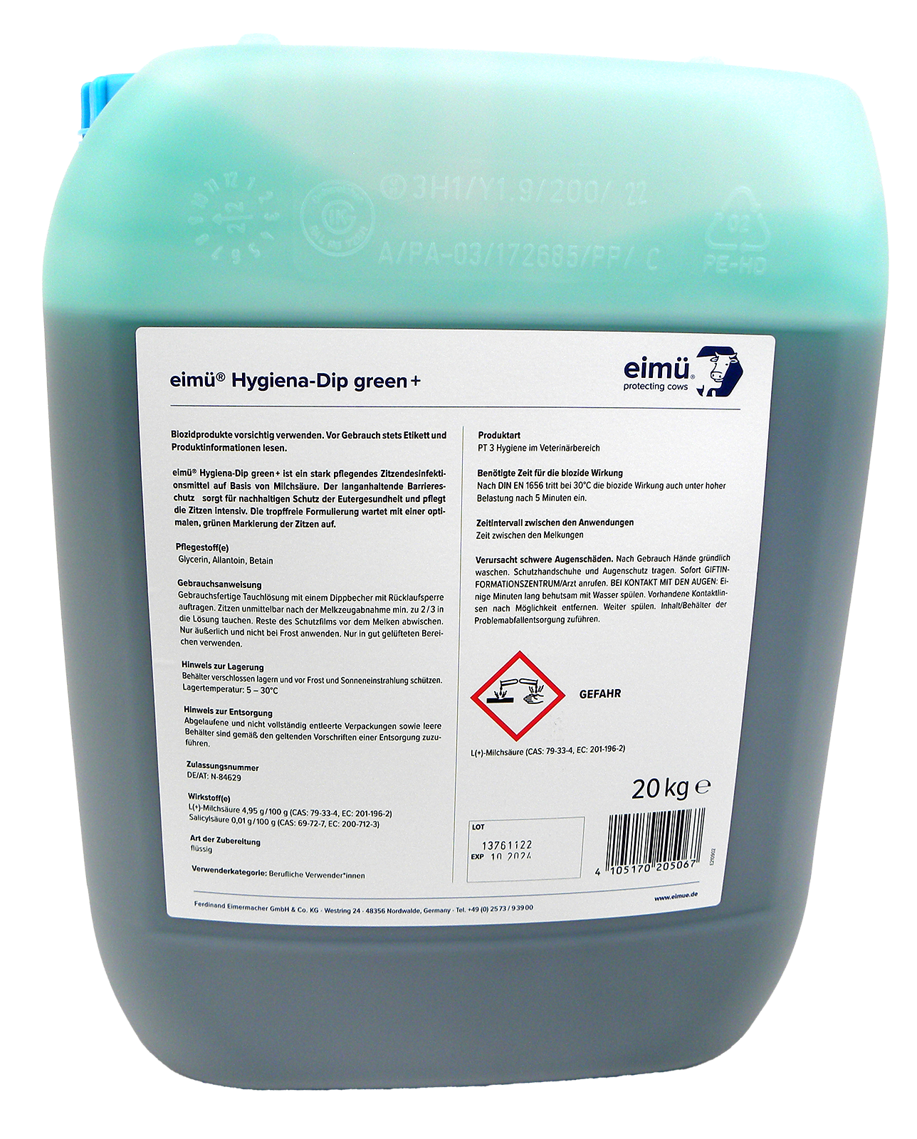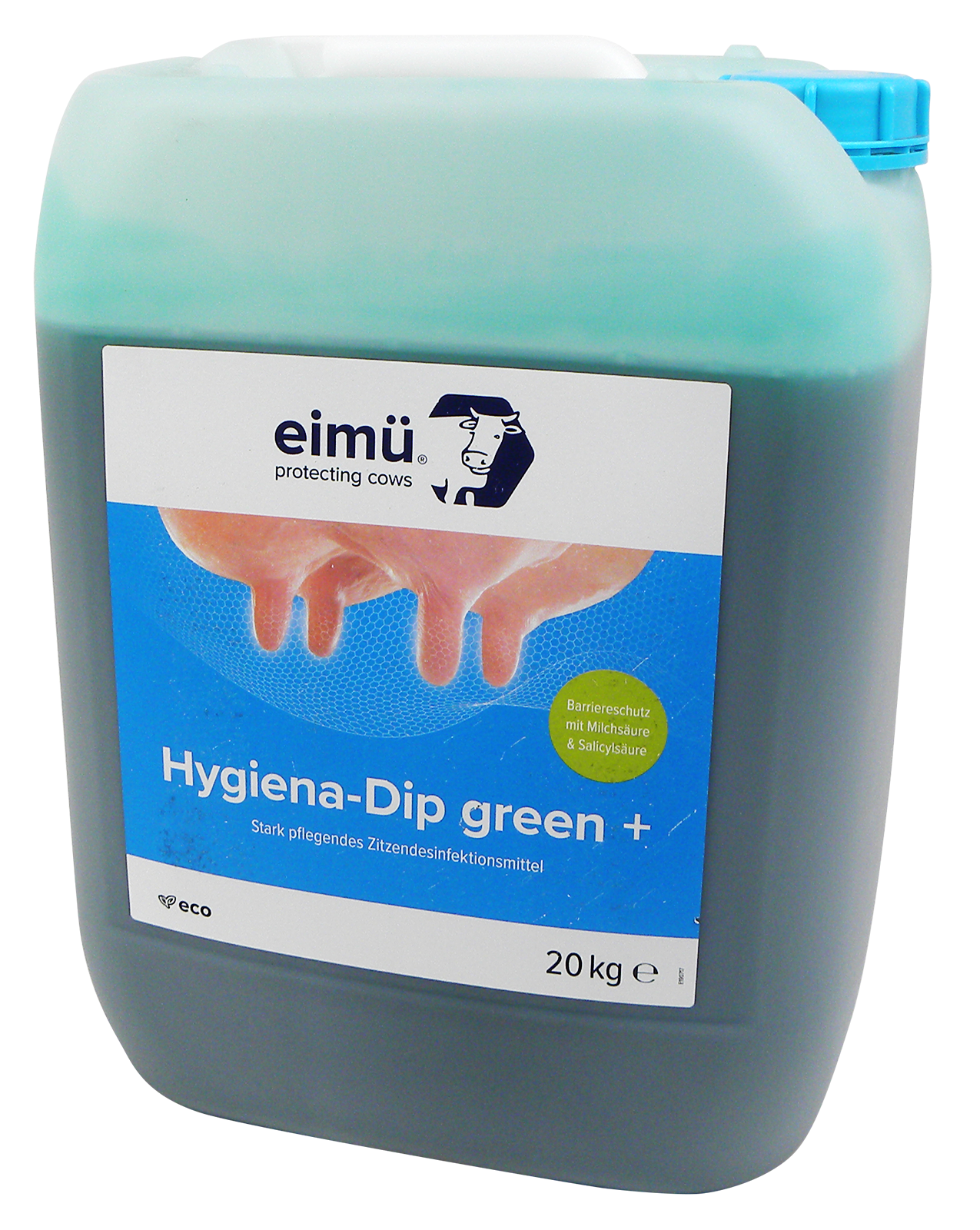 Das eimü Hygiena-Dip green+ ist ein leistungsfähiges Dipmittel welches auf einer optimierten Milchsäure-Formulierung basiert und der schnellen und zuverlässigen Desinfektion der Zitze dient. Dadurch wird der Eutergesundheit optimaler Schutz geboten. Zusätzlich glättet es Zitzenoberfläche, wodurch Rückzugsmöglichkeiten für Mastitiserreger eliminiert werden. Die Schutzfunktion der Zitzenhaut wird durch Glycerin und Betain gestärkt.