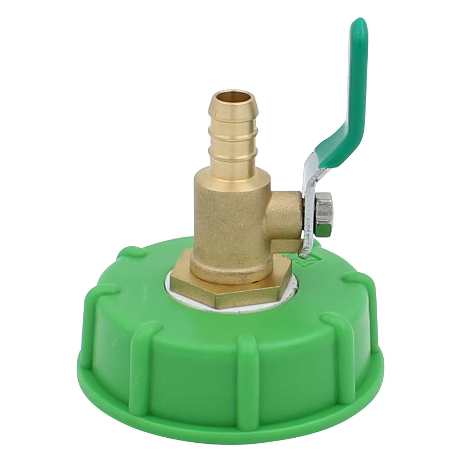 Kugelhahn aus Metall, mit Adapter auf IBC System, mit 12 mm Schlauchtüllenabgang. Mit fester Mutter zum direkten Anschluss an den IBC Tank.