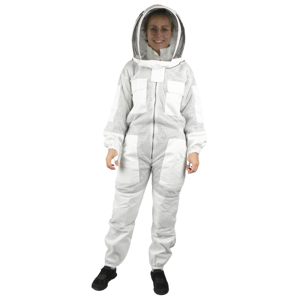 Imkeranzug mit integrierter Haube und hochwertige, stabile YKK-Reißverschlüsse.Durch den Aufbau aus 3 Schichten unterschiedlicher Netzstruktur bietet er nicht nur Schutz vor Bienen, sondern auch ausreichend Belüftung an heißen Tagen.Eine Fingerschlaufe sowie eine Fußschlaufe aus Gummi garantieren einen fixen Sitz. Mehrere Taschen erleichtern das Arbeiten. Stärker beanspruchte Stellen wie die Ellbogen- und Kniepartie wurden zusätzlich mit einer Schicht fester Baumwolle geschützt.Größen XS und S sind auch gut für kleinere Damen geeignet.Männer Größen ab M.