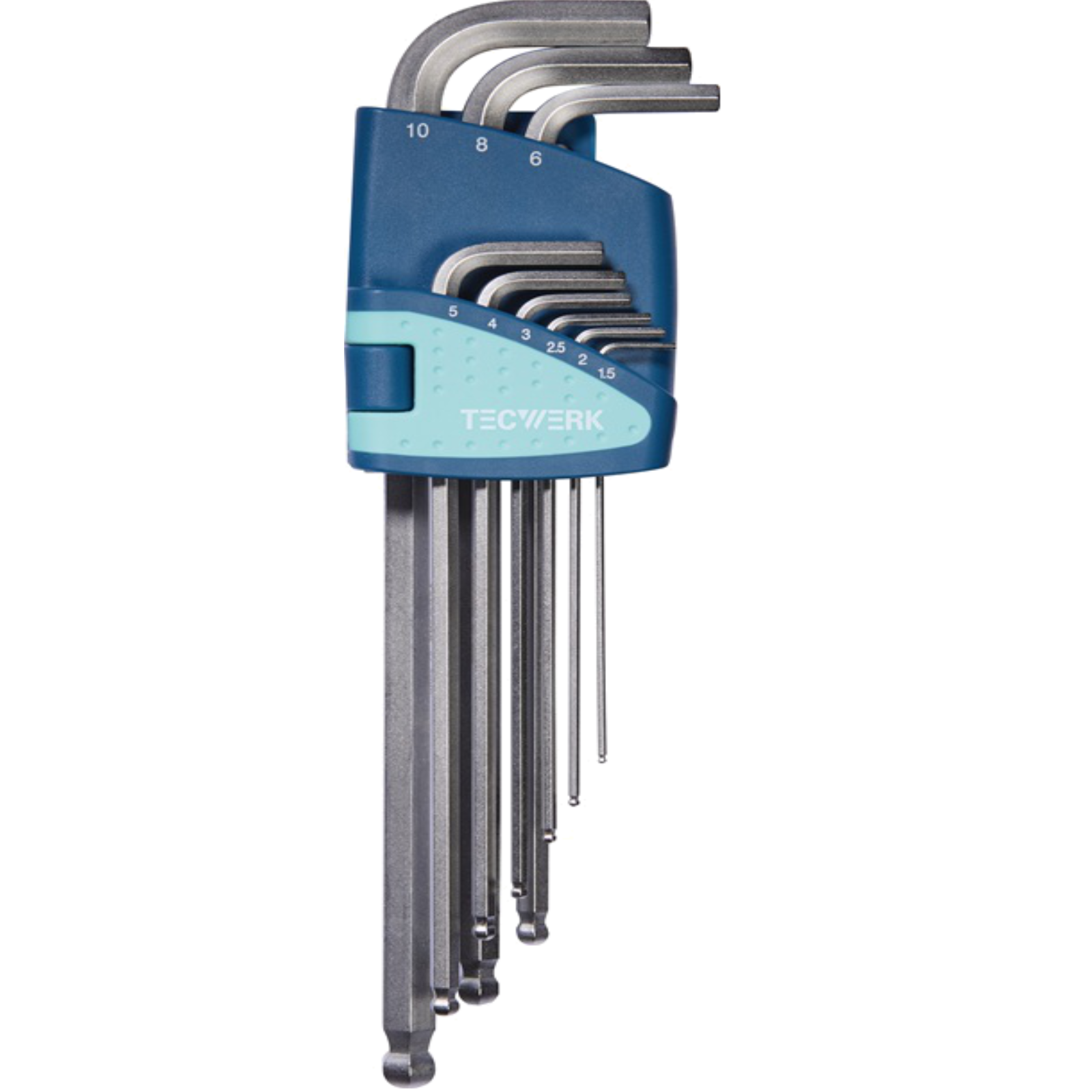 Inbusschlüssel-Satz mit Kugelköpfen, lang,S2-Stahl, mattverchromt, abgewinkelt, langer Schenkel mit Kugelkopf ermöglicht das Schrauben bis zu einem Winkel von 25° kurzer Schenkel gefasstWeitere technische EigenschaftenBestückung: SW 1,5 - 10 mm