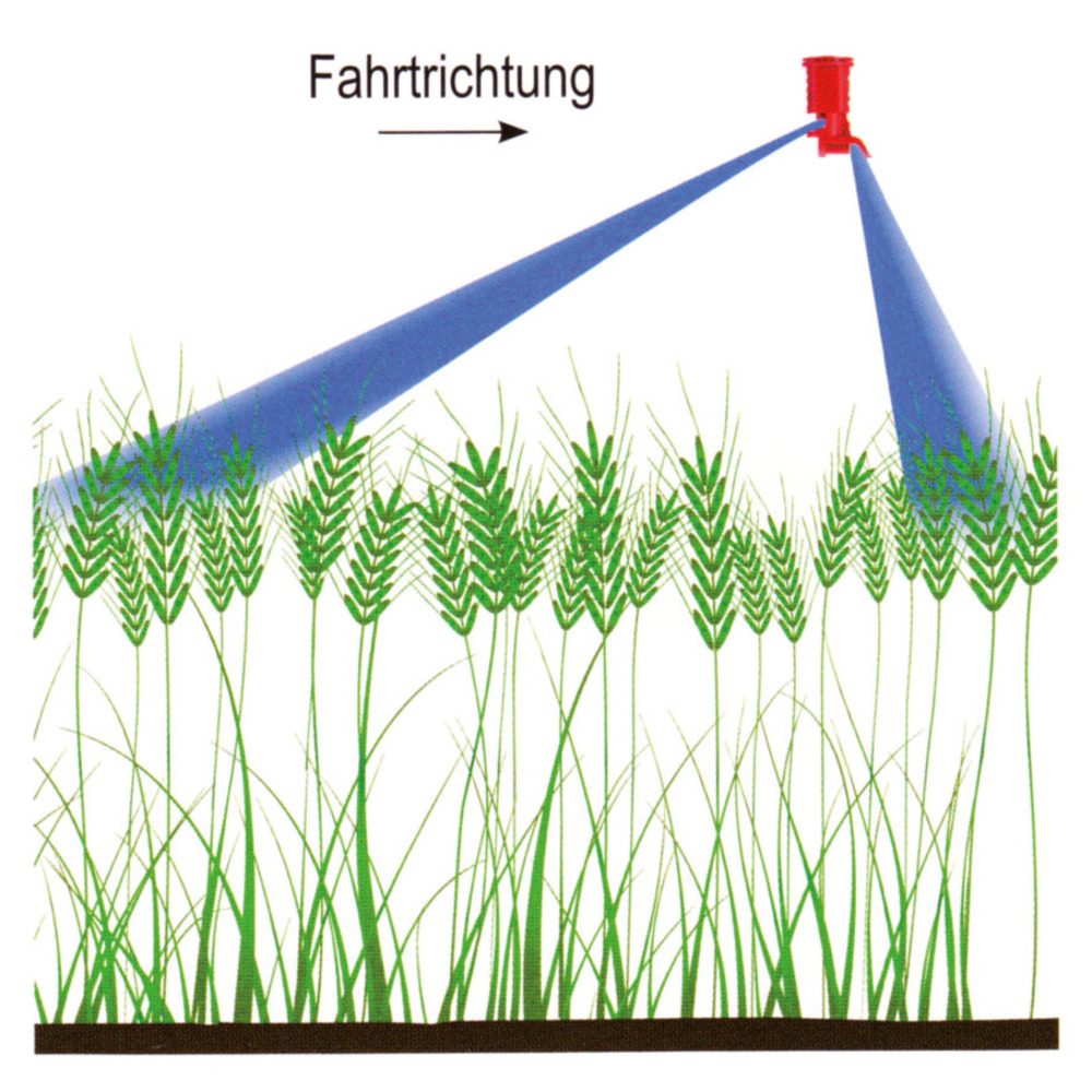 30° Strahl nach vorn in Fahrtrichtung optimiert die Eindringung im oberen Blatt- als auch Ährenbereich an Vorderseiten, 70° Strahl nach hinten bedeckt rückwertige Zielflächen. Tropfengrößen wie kurze AIXR Tee Jet und somit der perfekte Kompromiss zwischen Verlustminderung und Bedeckungsgrad. Große, runde freie Querschnitte für Flüssigkeit und Luft erhöhen die Betriebssicherheit und den Verschleiß.