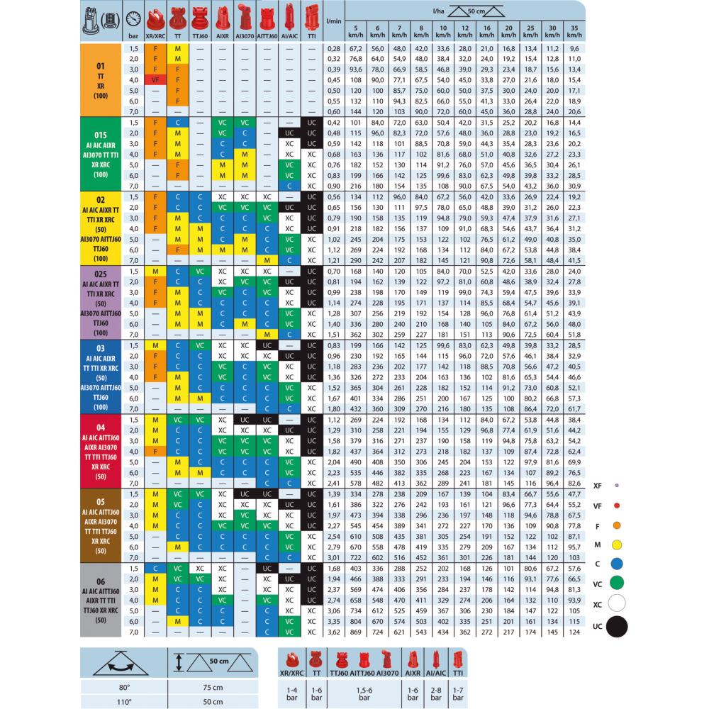 Anwendung: FlächenspritzungInjektordüse mit Doppelflachstrahl, jeweils 110° Spritzwinkel.Winkel von 60° zwischen beiden nach vorn und hinten ausgerichteten Spritzstrahlen.Tropfengröße wie lange AI TeeJet, dadurch sehr abdriftarm von 1,5 bis 4 bar, optimaler Druck für die Wirkung ab 4 bar, Abdriftreduzierung ausgezeichnet.Gute seitliche Anlagerung an aufrechtstehenden Zielflächen und intensive Durchdringung etagenförmiger Blattwerke.Große, runde Querschnitte für Flüssigkeit und Luft erhöhen die Betriebssicherheit und minimieren den Verschleiß.Je zwei äußere und innere Luftansaugbohrungen, Injektoreinsatz bei Bedarf herausnehmbar.Automatische Ausrichtung der Spritzstrahlen mit Quick TeeJet Kappe Best. Nr. 66757.Bei Verwendung der Düse mit einer Befestigungskappe eines anderen Herstellers als TeeJet auf die Ausrichtung der Düse achten. Der schwarze Punkt an der Düse muss in oder gegen die Fahrtrichtung zeigen.