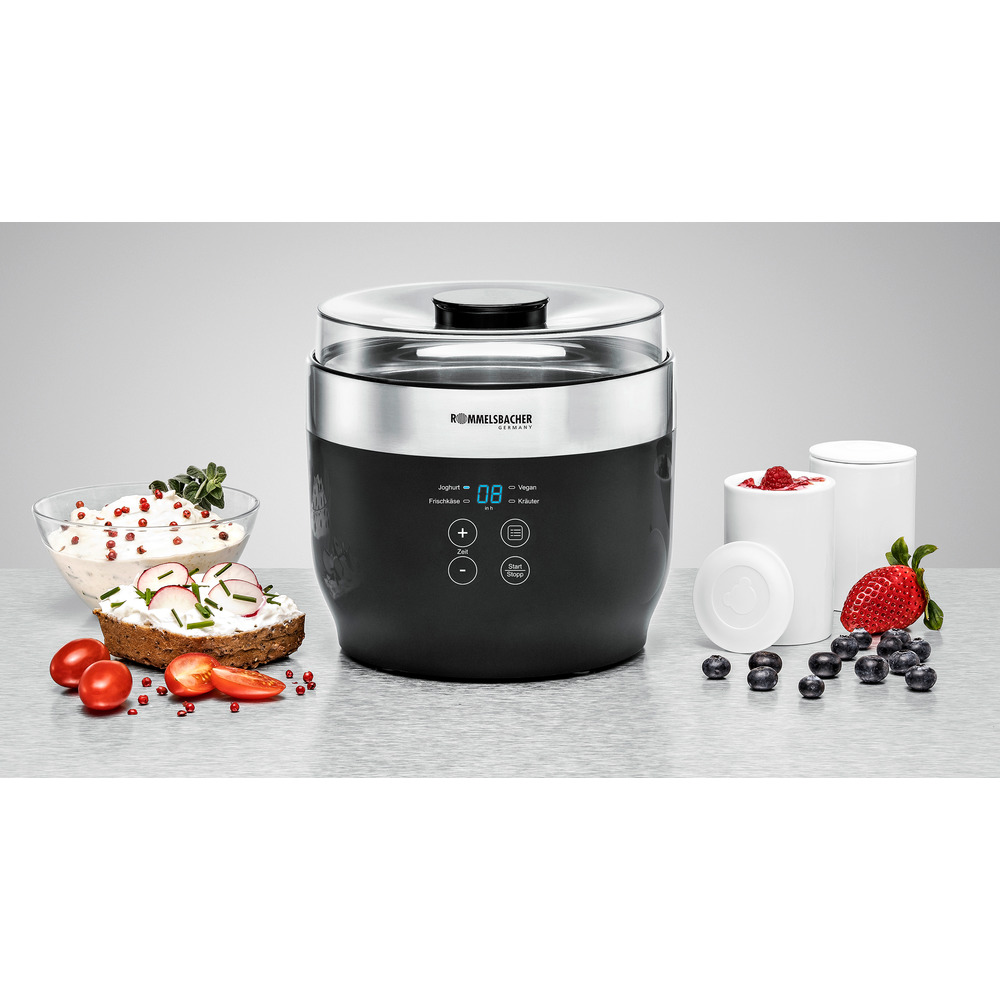 Selbstgemachter Joghurt und Frischkäse sind beliebte Produkte für alle, die Wert auf eine bewusste und gesunde Ernährung ohne unerwünschte Inhaltsstoffe legen. Ob pur, als Zutat in Süßspeisen oder deftigen Gerichten - die Möglichkeiten sind vielfältig. Mit diesem multifunktionalen Joghurt- und Frischkäsebereiter können Sie ganz einfach Zuhause Naturjoghurt, Frischkäse und auch Kräuterextrakte aus selbstgewählten Zutaten herstellen. Auch auf Vorrat, denn in einem Durchgang erhält man beispielsweise bis zu 1200 g Joghurt, der anschließend im Kühlschrank gut eine Woche haltbar ist. Gerät verfügt über 4 voreingestellte Programme mit unterschiedlichen Temperaturen für: Naturjoghurt (42 °C), Joghurt vegan/laktosefrei (38 °C), Frischkäse (30 °C), Kräuter-Extrakt (55 °C).