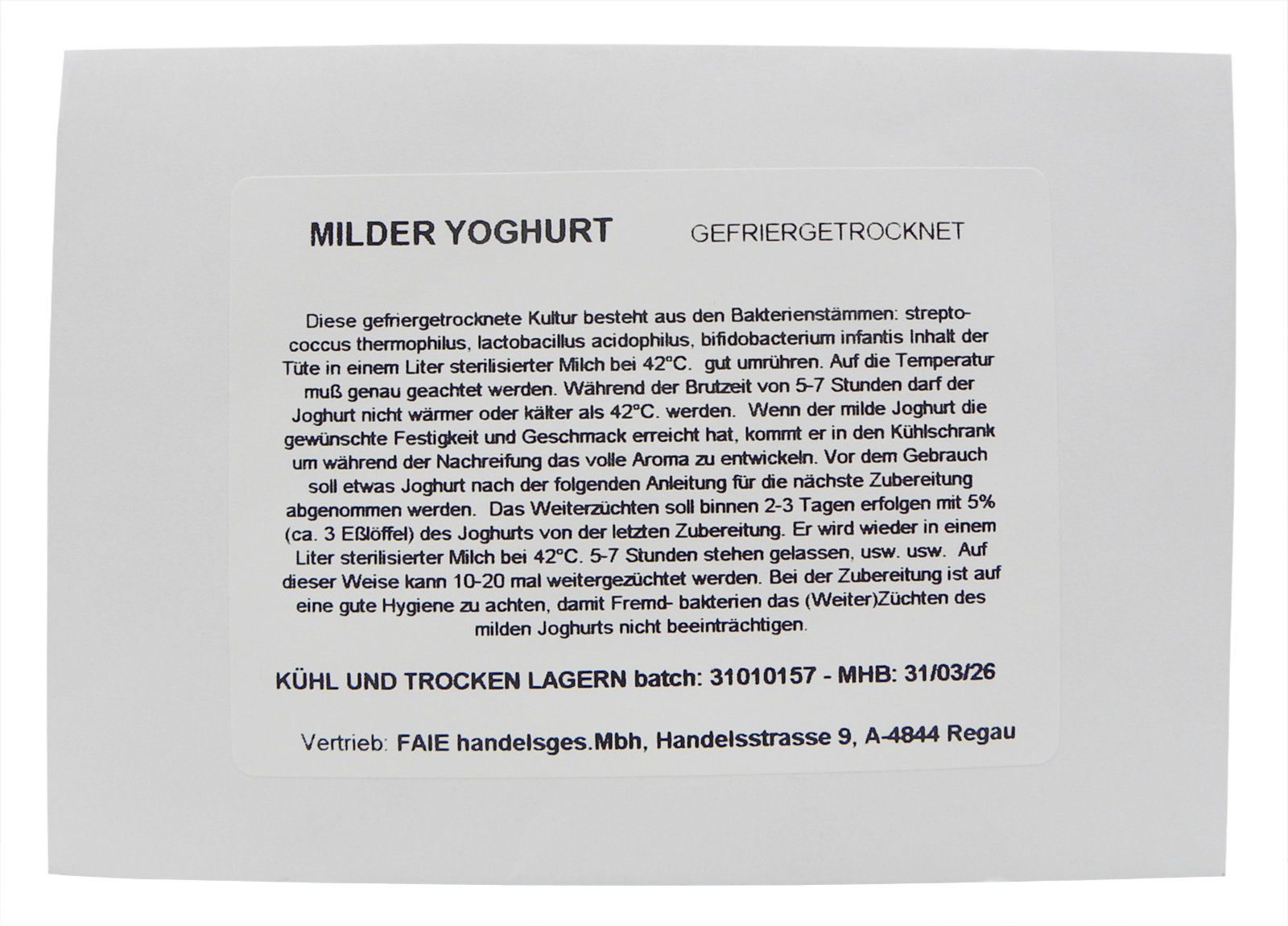 Gefriergetrocknete Starterkultur. Mischkultur aus verschiedenen Bakterienstämmen, zeichnet sich durch ihren milden Geschmack aus. Zum Ansatz von 1 L Milch.