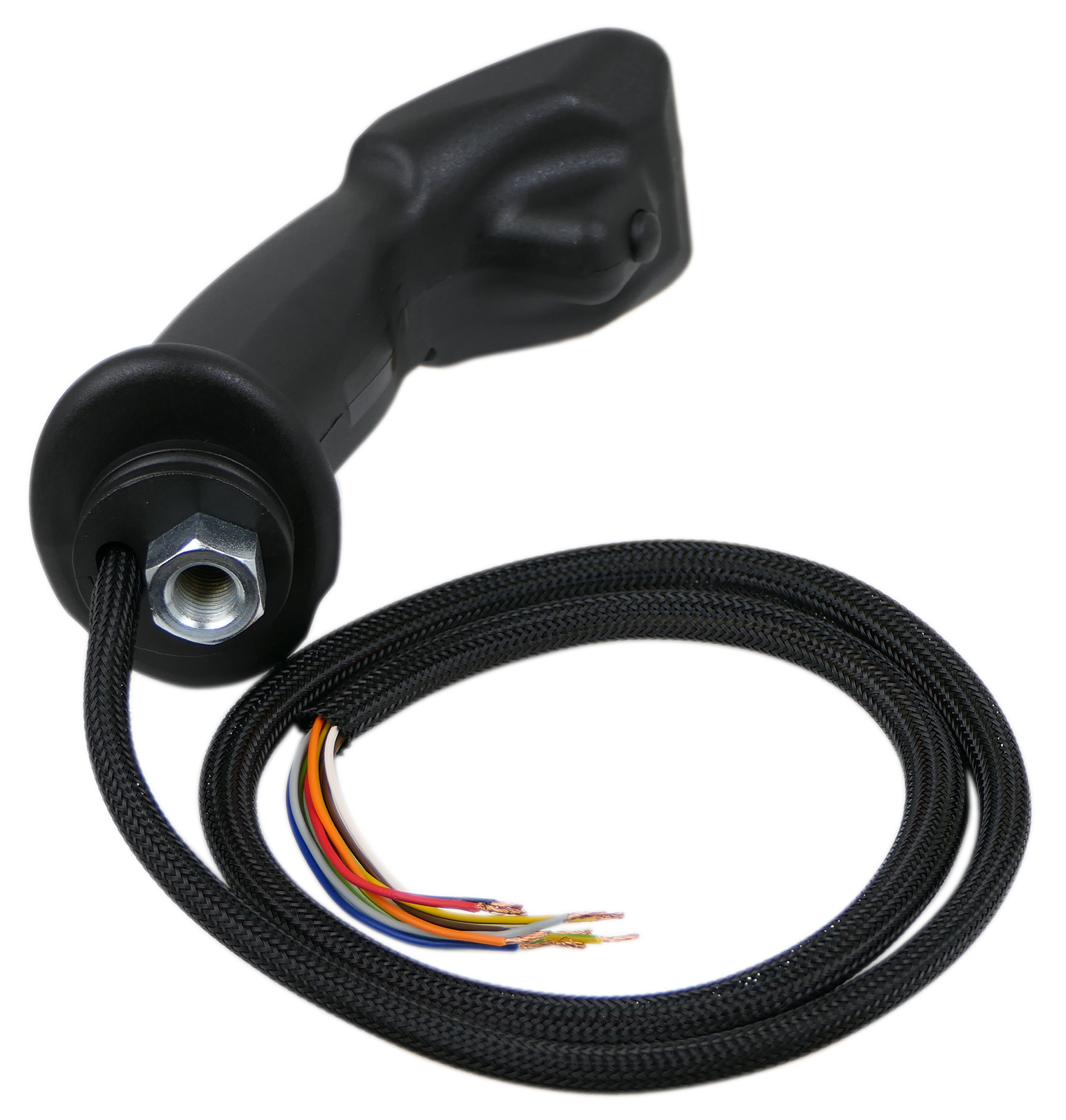 Ergonomisch geformter Griff zum universellen Einsatz in der Landwirtschaft. Befestigung mit einem Innengewinde M12x1,25mm. Der Kabelstrang hat eine Länge von 900mm und die einzelnen Kabel einen Leitungsquerschnitt von 0,5mm². Die Schutzklasse der Drucktaster ist IP 67, der Griff hat als eine Einheit die Schutzklasse IP 54.Die max. Spannung beträgt 0-15V und die max. Stromstärke ist 5A.Der Temperaturbereich liegt bei -40°C bis +85°C.