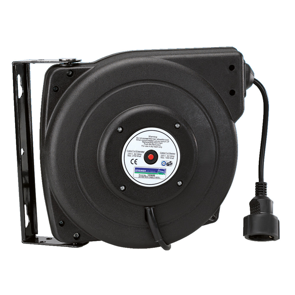 Elektro-Kabelaufroller mit 20 m 3x1,5 mm PVC-Kabel. Belastbar bis max.2750 W (abgerollt) bzw.1000 W (aufgerollt), Schutzart IP 42, Gewicht ca. 6 kg. Komplett mit schwenkbarer Wandhalterung und CE-Schuko-Kupplung sowie 1,5 m Anschlusskabel.