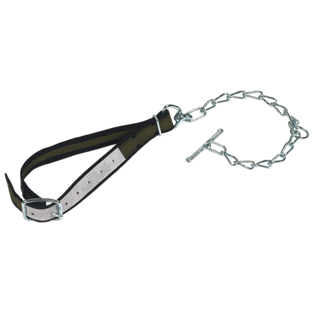 Kälberanbindung in Top-Qualität! Komplett mit Halsband (85 x 4 cm) und verzinktem Kettenteil (ca. 60 cm Länge) mit Wirbel, Knebel und einer Gliedstärke von 5 mm.