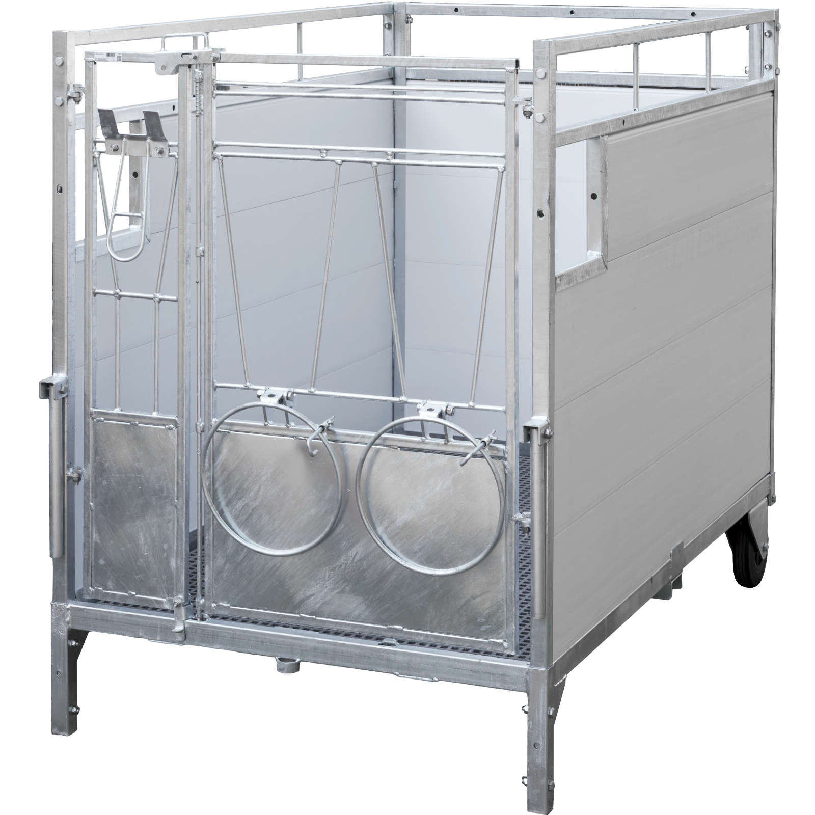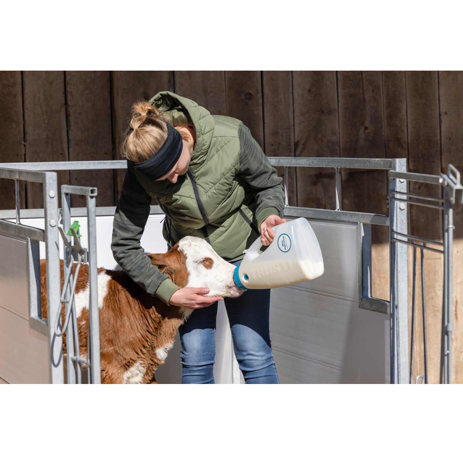 Die Kälberbucht sorgt dafür, dass das Kalb viel frische Luft erhält, aber keiner Zugluft ausgesetzt wird. Ebenso wird es von schädlichen Krankheitskeimen abgeschirmt. Das Tier liegt in der Kälberbox nicht direkt auf dem Boden, sondern auf den erhöhten Rosten. Somit hat es das Kalb wärmer und trockener. Die zweigeteilte Türe ermöglicht ein Betreten und Verlassen der Box, ohne dass das Kalb beim Tränken gestört wird.Vorteile: