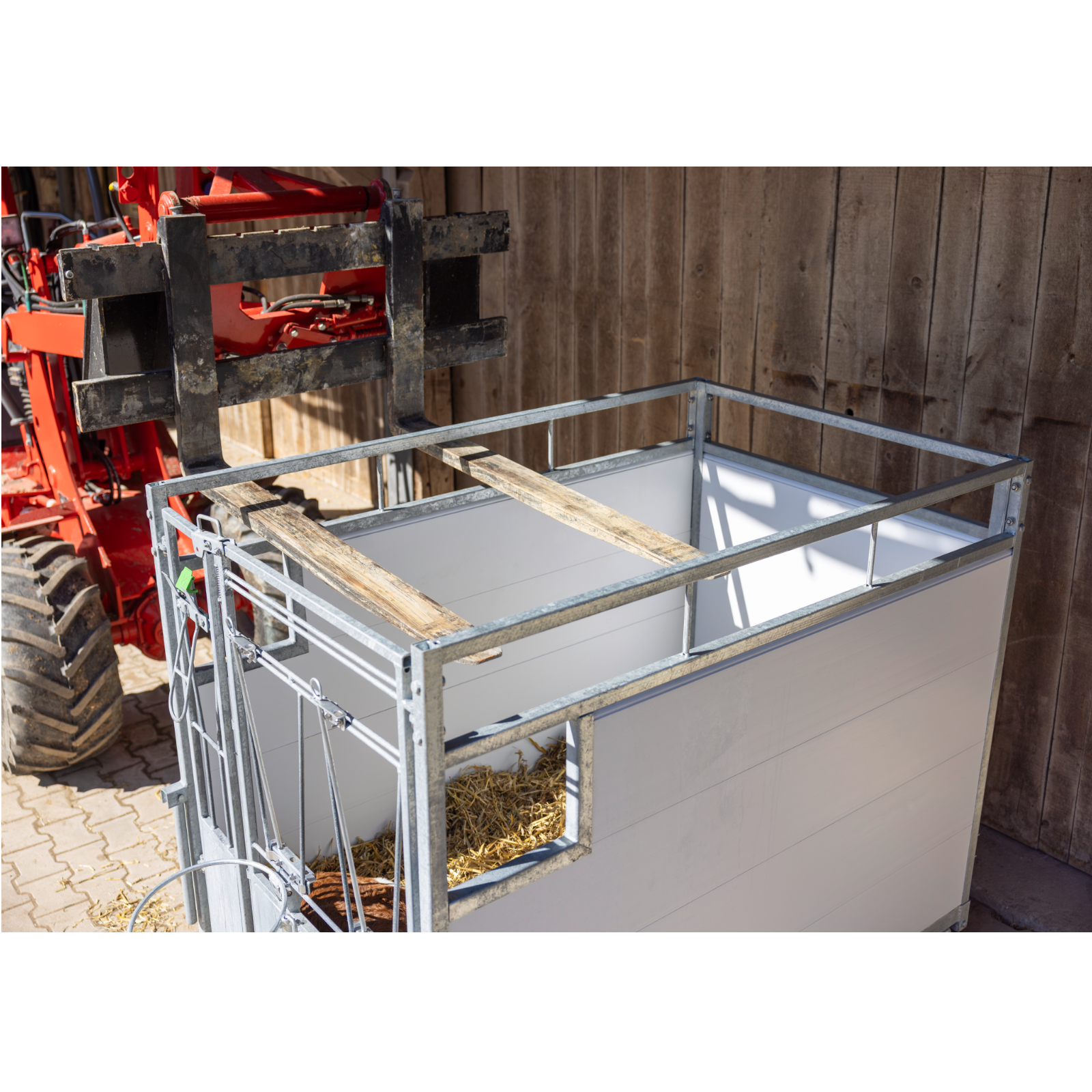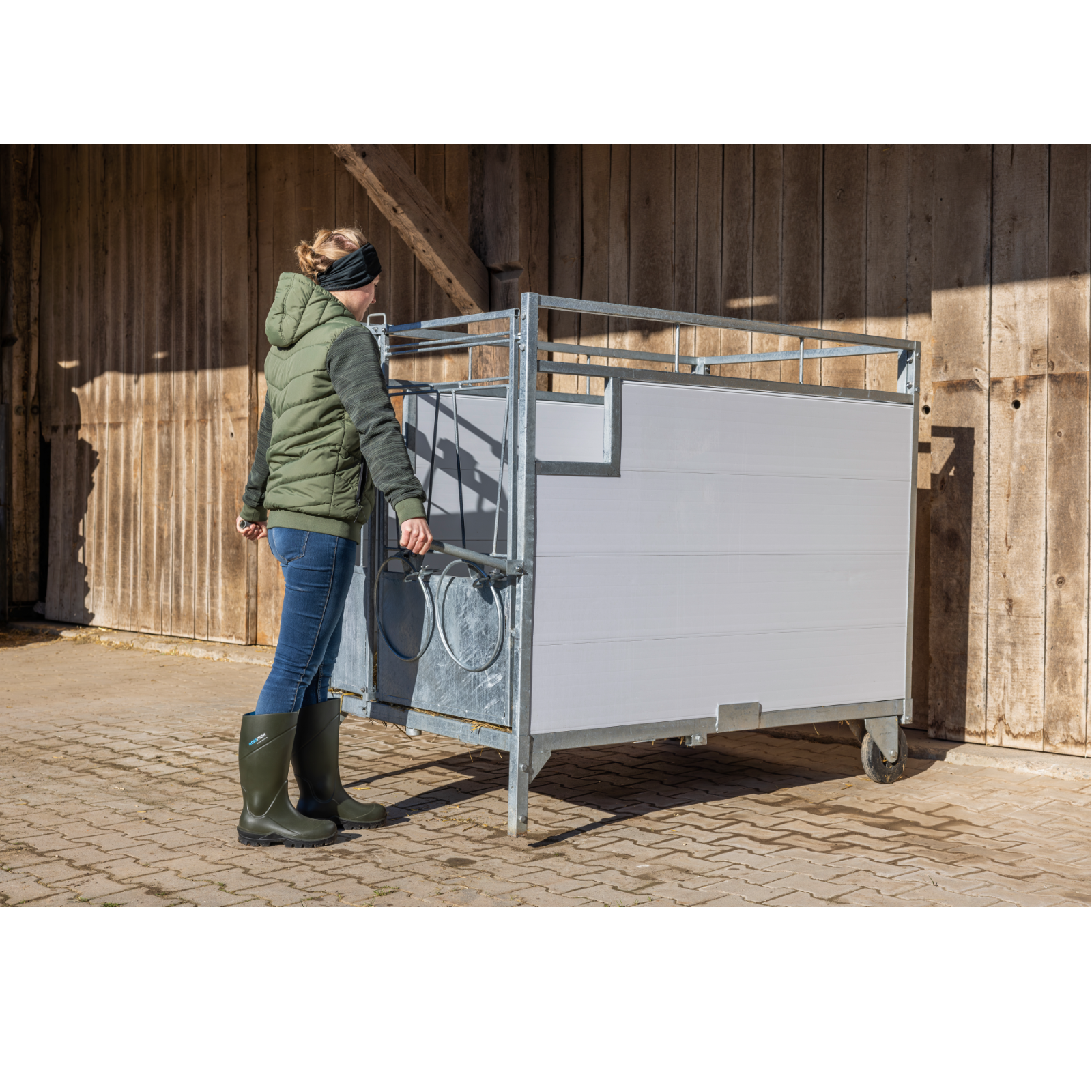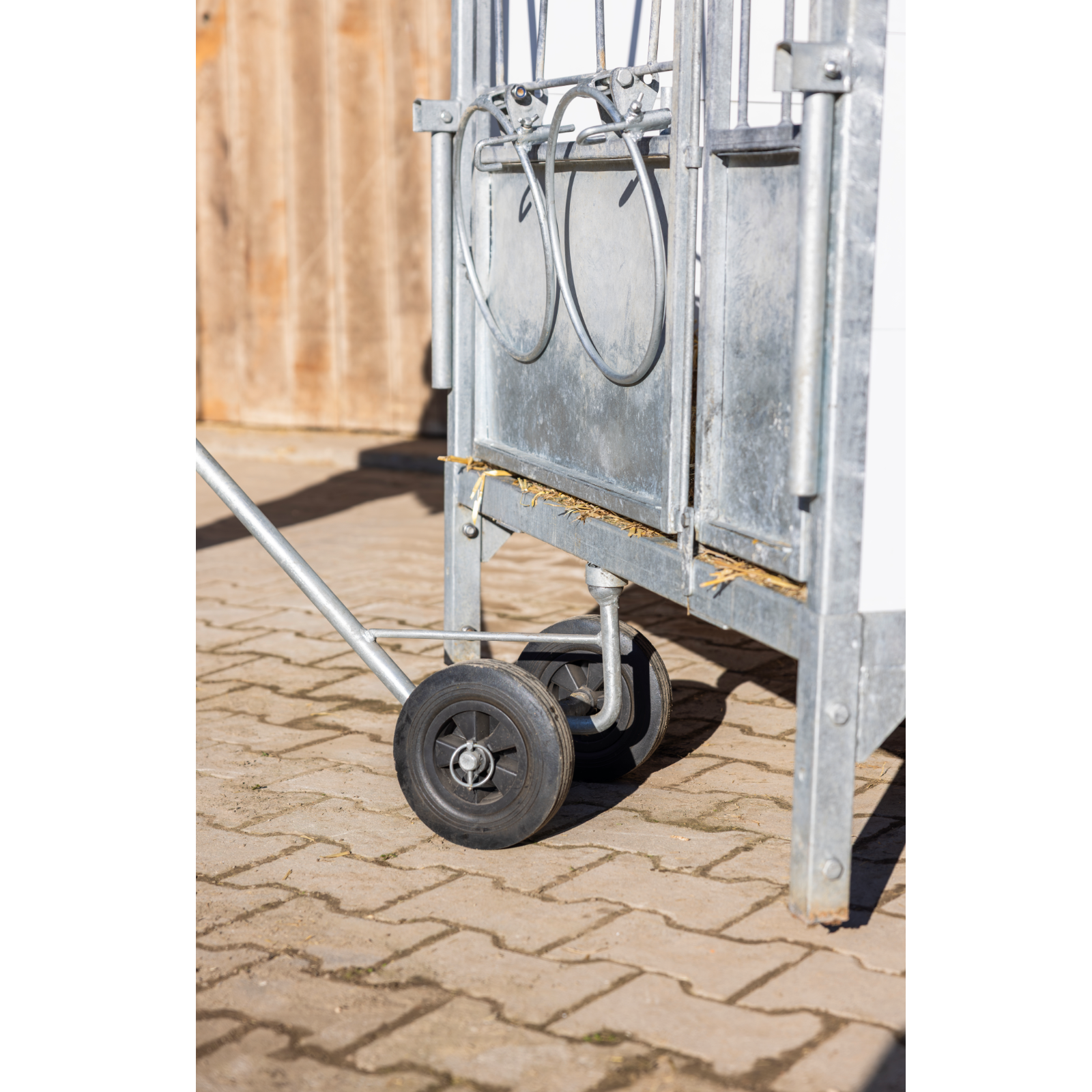 Zum einfachen Versetzen und Lenken der Kälberbox Best.Nr. 131079. Zwei Räder für bessere Manövrierbarkeit. Länge ca. 140 cm.