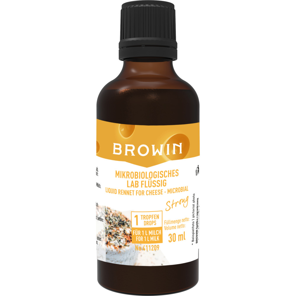 Mikrobielles (pflanzliches), hochdosiertes Lab zur Herstellung von Kuh-, Ziegen-, und Sojamilch. Der enthaltene Bakterienstamm Rhizomucor miehei ist auch zur Herstellung von veganem Käse geeignet.Anwendung:1. Pro Liter Milch 1 Tropfen Lab abmessen2. Je nach Käsesorte die Milch auf 33°C erhitzen und das Lab hinzugeben und vermischen3. ca. 60 Minuten arbeiten lassen, bis das Produkt weiter verarbeitet werden kannZur bis 30°C erwärmten Milch eine entsprechende Menge Calciumchlorid, das vorher in einer kleinen Menge von gekochtem Wasser aufgelöst wurde, dazugeben. Mischen und 10 Minuten lang stehen lassen. Anschließend die Milch bis zu einer Temperatur von 37-38°C erwärmen und eine entsprechende Menge des hochdosierten Labes dazugeben. Gründlich vermischen. Mit dem Mischen aufhören und 50-70 Minuten lang warten bis sich eine kompakte Dickschicht bildet. Die entstandene Dickschicht in ca. 1-1,5 cm große Würfel schneiden. Das entstandene Käsekorn sanft umrühren und nach ca. 5 Minuten mit dem Schaumlöffel in eine mit einem Käsetuch ausgelegte Form geben. Den Käse 20-24 Stunden stehen lassen. Alle paar Stunden umdrehen.Zusätzliche Informationen:Je nach Käsesorte ist es erforderlich, das die entsprechende Menge Calciumchlorid zugegeben wird. Die optimale PH-Wert für die Wirkung des Lab beträgt zwischen 6 und 7.Aufbewahrung und Lagerung:Im Kühlschrank bei ca. 4-7°C