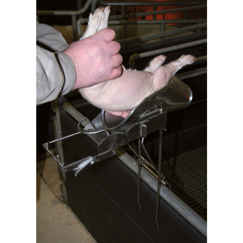 Für die Montage auf die Zwischenwand im Abferkelstall. Das Ferkel wird auf dem Rücken liegend mit dem Kopf nach vorn in das Gerät gelegt, durch Anbringen einer Klemme in Richtung des Kopfes werden die Hinterpfoten fixiert und die untere Körperhälfte gespannt, die Kastration kann nun von einer Person vorgenommen werden. Auch für andere Eingriffe verwendbar. Hygienisch und leicht zu reinigen, da ganz aus Edelstahl. Halterung (Nr. 74406) nicht im Lieferumfang enthalten. Bitte lokale Tierschutzbestimmungen beachten!