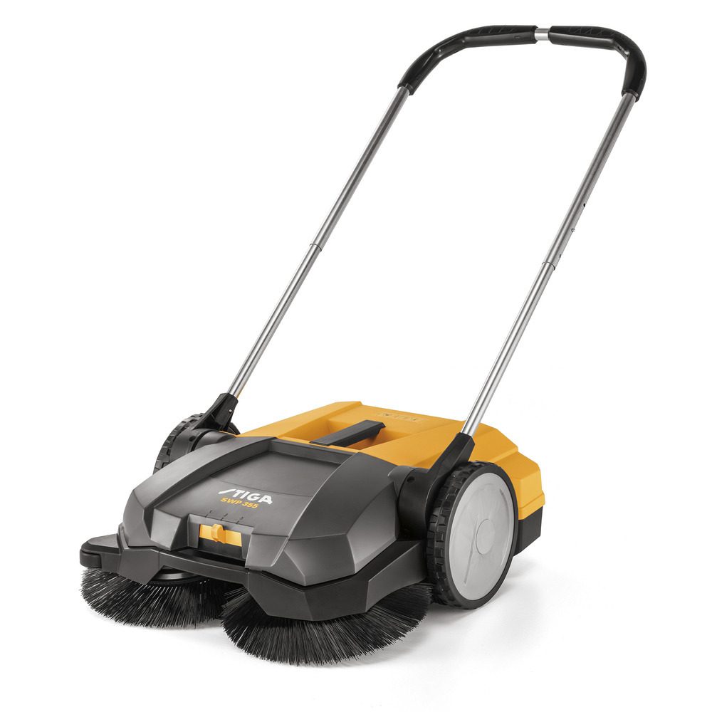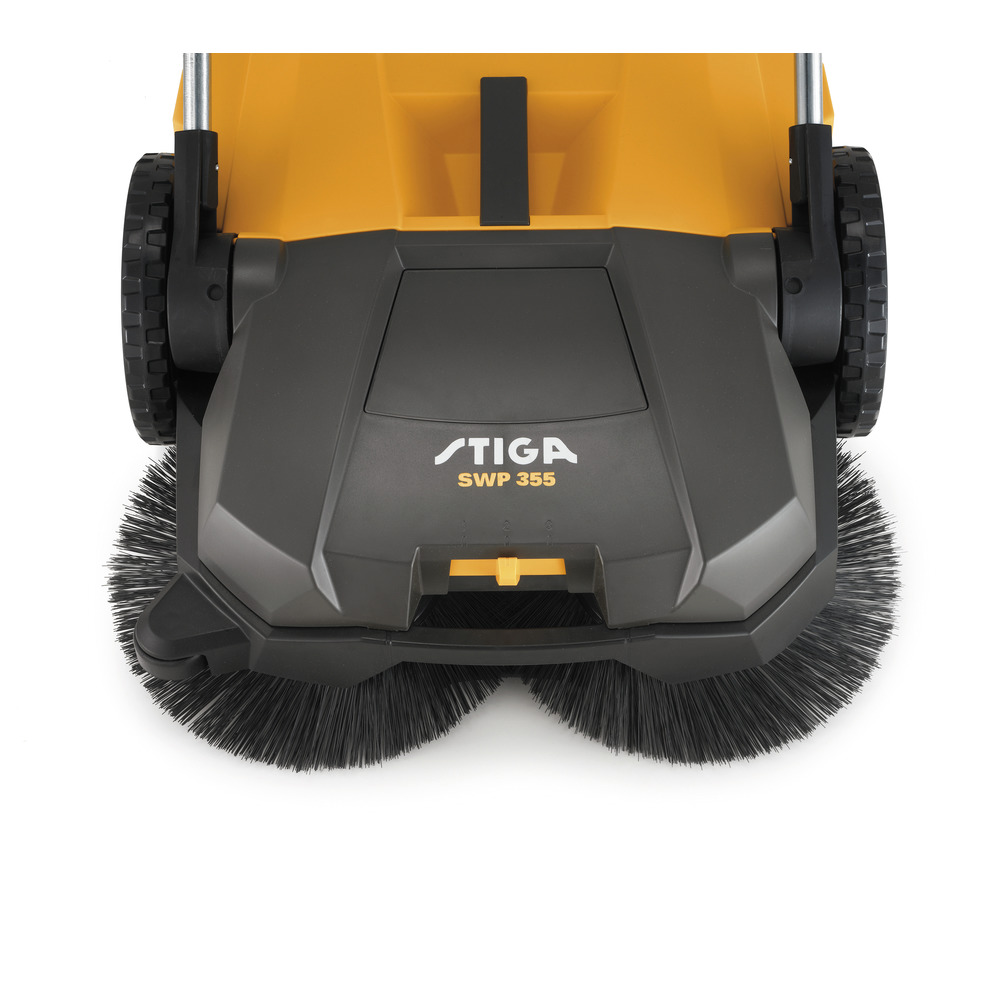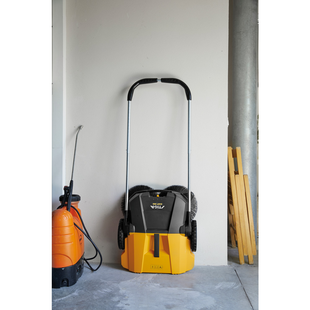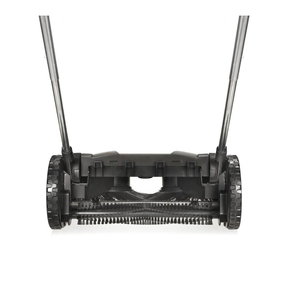 Handliche Kehrmaschine ohne Antrieb für den Außenbereich. zwei gegenläufige Rotationsbürsten mit je 30 cm Durchmesser und 20 Liter Schmutzbehälter.