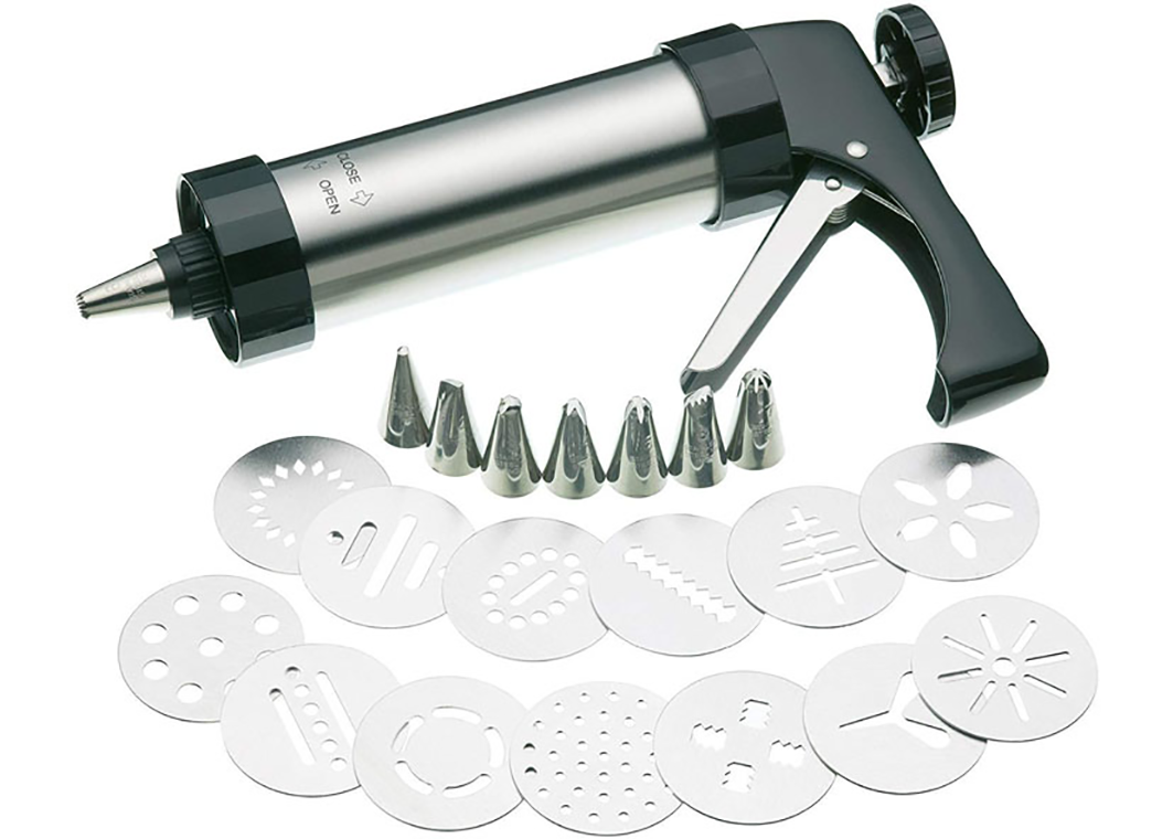Praktisch und schnell Kekse backen - im Nu sind sie fertigmit 8 verschiedenen Tüllen und 13 Matrizen aus Alu,der Fantasie sind beim Formen und Verzieren keine Grenzen gesetzt.Hochwertige Qualität.