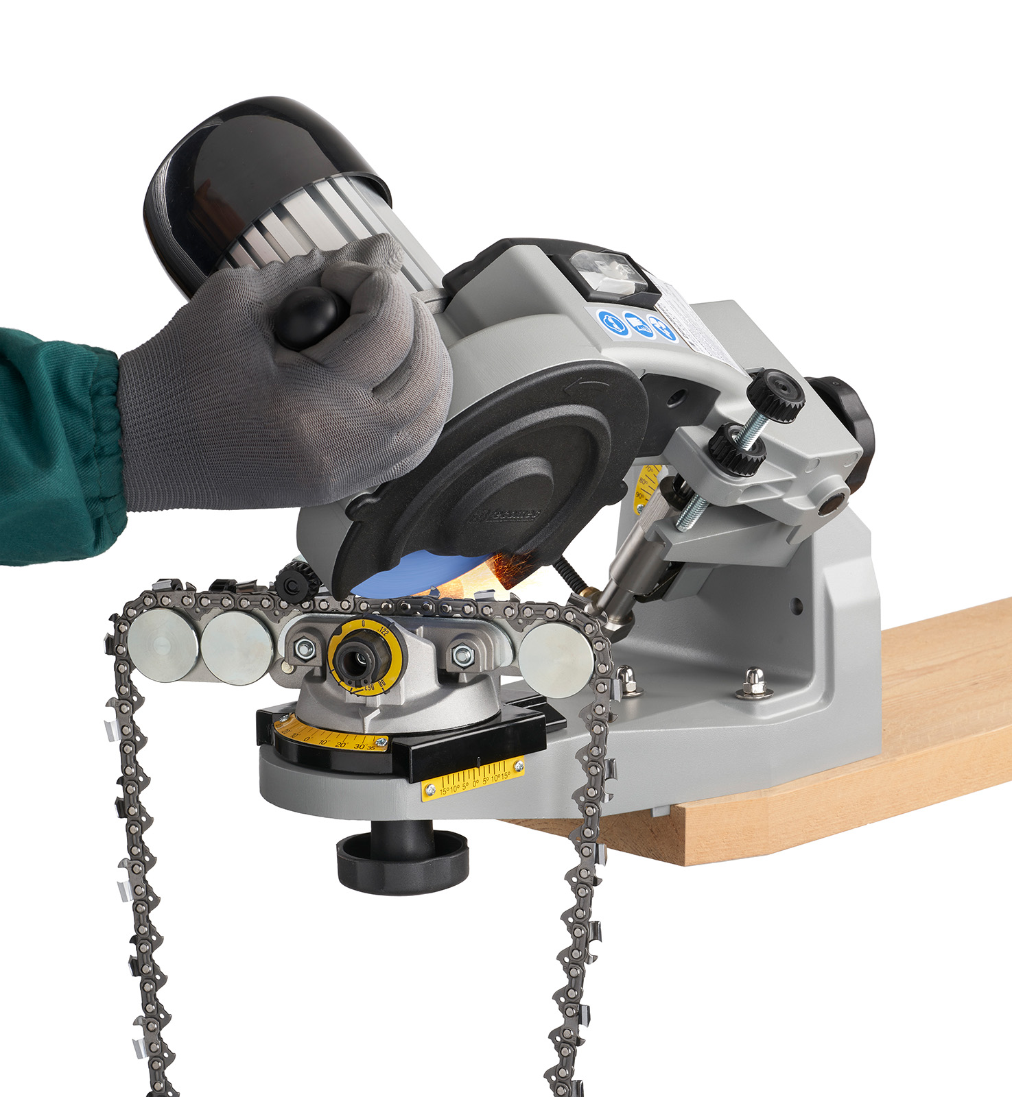 Beim Absenken der Scheibe wird die Sägekette automatisch fixiert, beim Heben wieder geöffnet. Sie sparen dadurch wesentlich mehr Zeit. Viele Einstellmöglichkeiten am Gerät ergeben ein schnelles, exaktes und gleichmäßiges Schleifen der Sägekette.