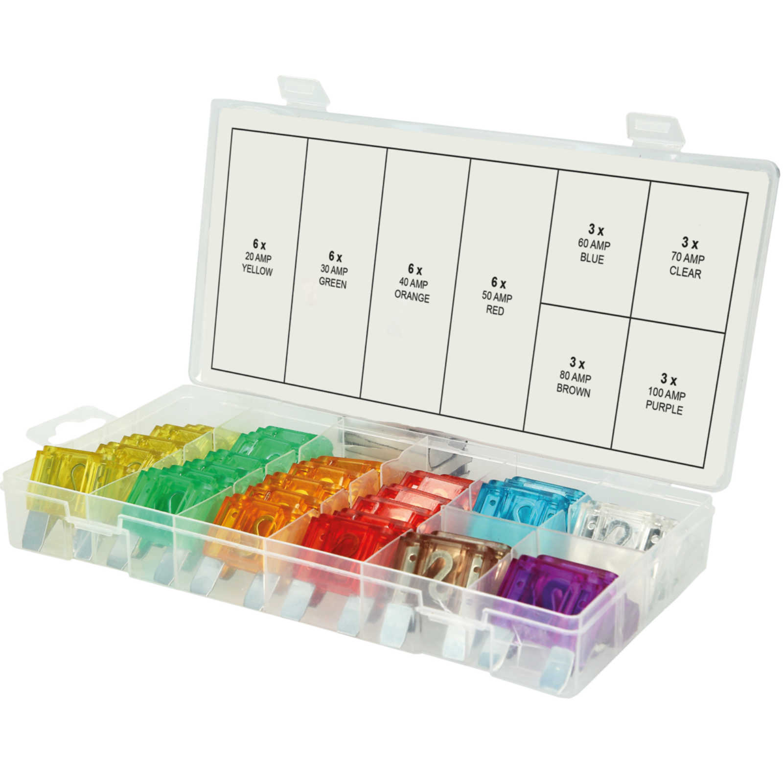 KFZ -Sicherungssortiment, 36-teilig – Praktisch und übersichtlichDieses 36-teilige KFZ-Sicherungssortiment bietet Ihnen zuverlässige Sicherungen für Ihr Fahrzeug – ideal für Reparaturen und Wartung. Die Sicherungen entsprechen der Norm ISO 8820-3, was für hohe Qualität sorgtDie einzelnen Sicherungen sind nach Amperegrößen farblich gekennzeichnet. So finden Sie schnell die passende Sicherung und sparen Zeit. Egal ob für PKW, LKW oder landwirtschaftliche Maschinen – mit diesem Sortiment haben Sie für jede Situation die richtige Sicherung parat.Inhalt: 6x20Amp, 6x30Amp, 6x40Amp, 6x50Amp, 3x60Amp, 3x70Amp, 3x80Amp, 3x100AmpVorteile auf einen Blick: