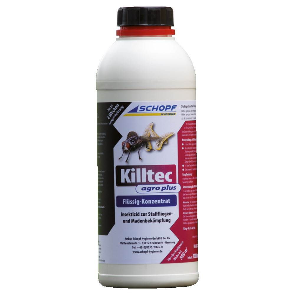 - 1 l mit 10 l Wasser verdünnen. Mittels einer Rückenspritze in die Güllekanäle (die bevorzugten Brutstätten der Fliegenmaden) sprühen. Auf ca. 1 m² wird 100 ml gebrauchsfertige Lösung fein verteilt, 11 Liter reichen für 110 m²