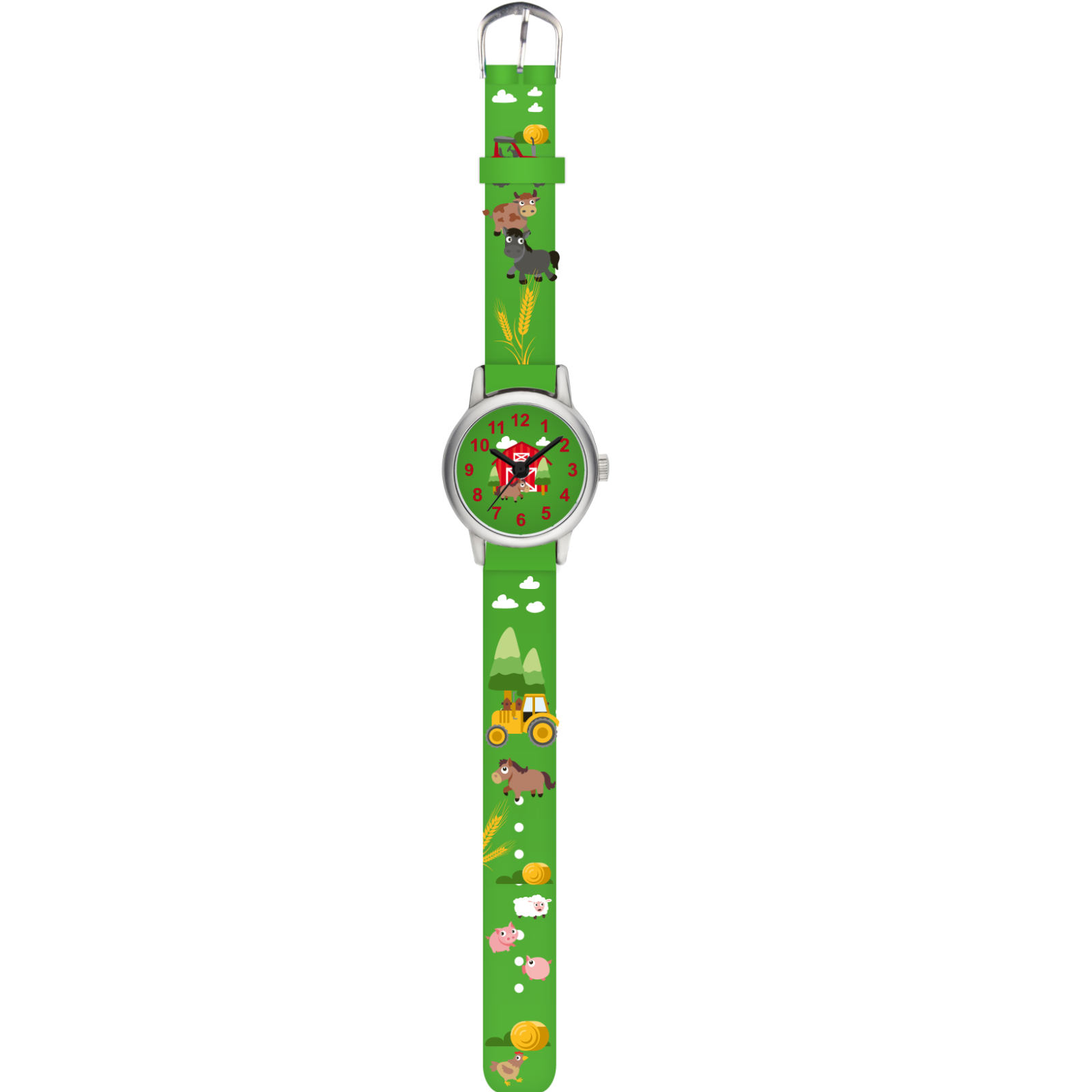 Kinderuhr Bauernhof – Zeit lernen mit Traktor, Kuh & Co.Mit der Kinderuhr Bauernhof wird das Uhrzeitlernen zum echten Erlebnis – mitten im Leben auf dem Land!Das farbenfrohe Ziffernblatt mit den Zahlen von 1 bis 12 ist klar gestaltet und hilft Kindern, die Uhrzeit schnell zu erkennen und zu verstehen.Drei Zeiger (für Stunden, Minuten und Sekunden) zeigen die Zeit genau an und unterstützen so das tägliche Üben.Das liebevolle Bauernhof-Motiv mit Tieren, Traktor und Scheune begeistert kleine Landfreunde und bringt ländliches Flair direkt ans Handgelenk.Ob auf dem Spielplatz, in der Schule oder beim Besuch auf dem Hof – diese Uhr passt einfach immer.Das weiche Silikonarmband ist angenehm zu tragen, hautfreundlich und besonders strapazierfähig.Dank der 8 Einstelllöcher lässt es sich individuell anpassen und wächst mit dem Kind mit.So sitzt die Uhr bequem und sicher – auch bei wilden Spielen im Freien.Empfohlen für Kinder ab ca. 4 Jahren, die ihre erste eigene Uhr tragen und dabei Spaß an Tieren und Traktoren haben.