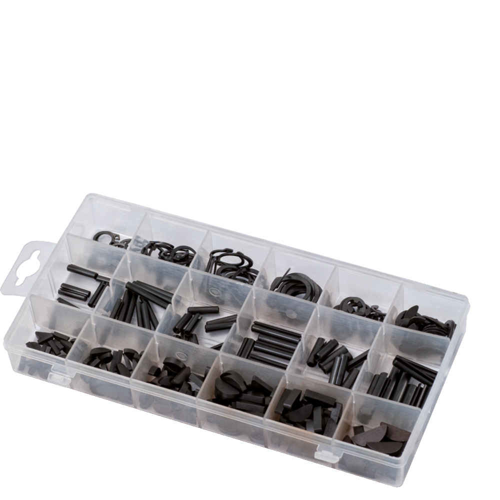 Kleinteile- Sortiment im Kunststoffkoffer. Inhalt: Seegeringe, Sicherungsringe, Spannstifte und Passkeile in sämtlichen Größen.